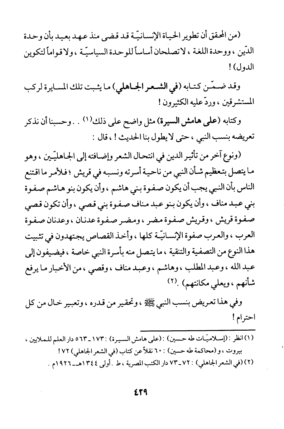 (¬1) انظر: (إسلاميّات طه حسين): (على هامش السيرة): 173 - 563 دار العلم للملايين، بيروت، و (محاكمة طه حسين): 60 نقلاً عن كتاب (في الشعر الجاهلي) 72!