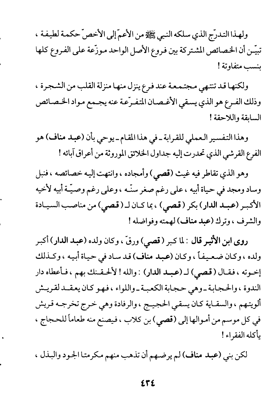 وهذا التفسير العملي للقرابة -في هذا المقام- يوحي بأن (عبد مناف) هو الفرع القرشي الذي تحدرت إليه جداول الخلائق الموروثة من أعراق آبائه!