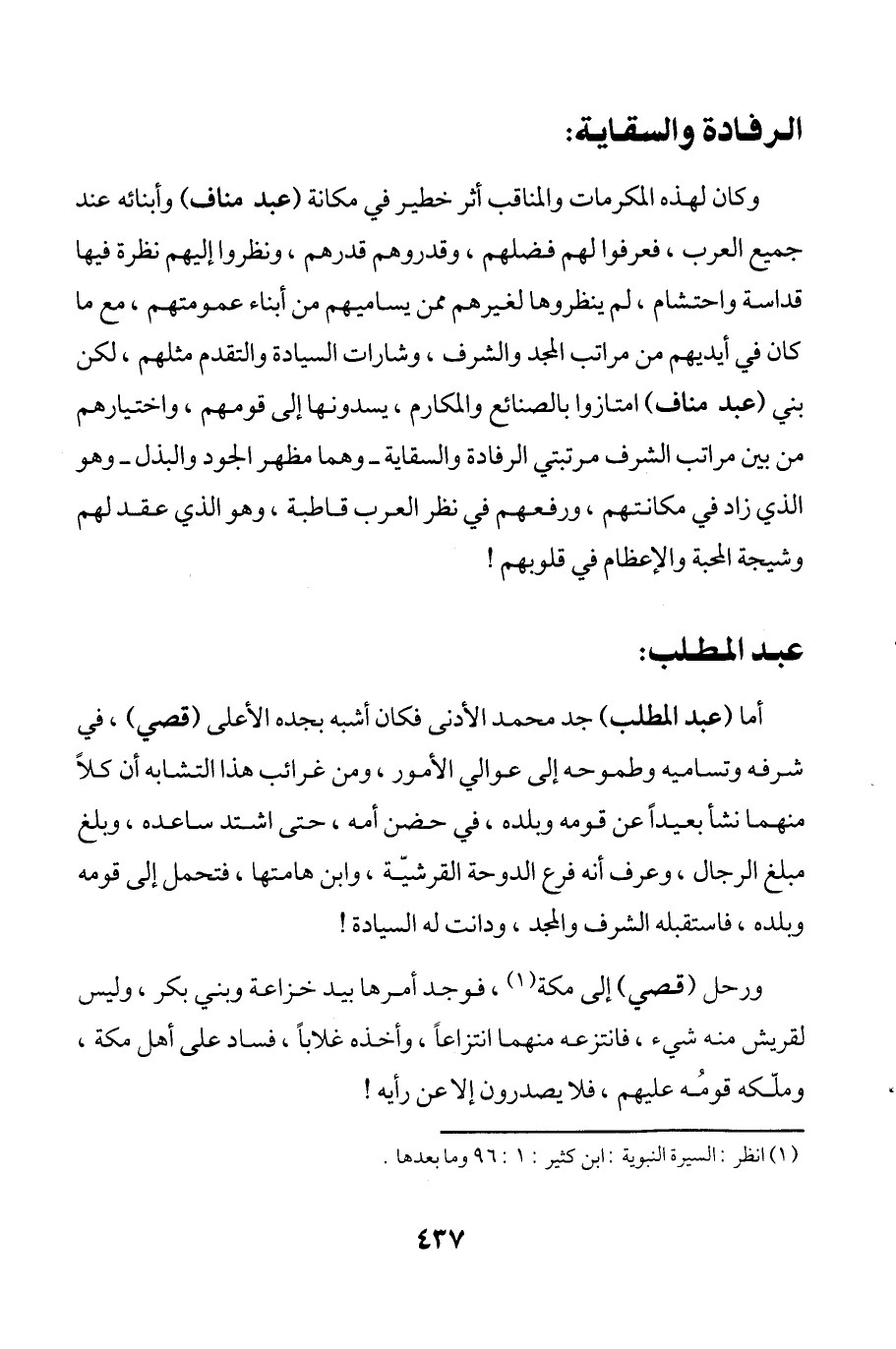 أما (عبد المطلب) جد محمد الأدنى فكان أشبه بجده الأعلى (قصي)، في شرفه وتساميه وطموحه إلى عوالي الأمور، ومن غرائب هذا التشابه أن كلاً منهما نشأ بعيداً عن قومه وبلده، في حضن أمه، حتى اشتد ساعده، وبلغ مبلغ الرجال، وعرف أنه فرع الدوحة القرشيّة، وابن هامتها، فتحمل إلى قومه وبلده، فاستقبله الشرف والمجد، ودانت له السيادة!