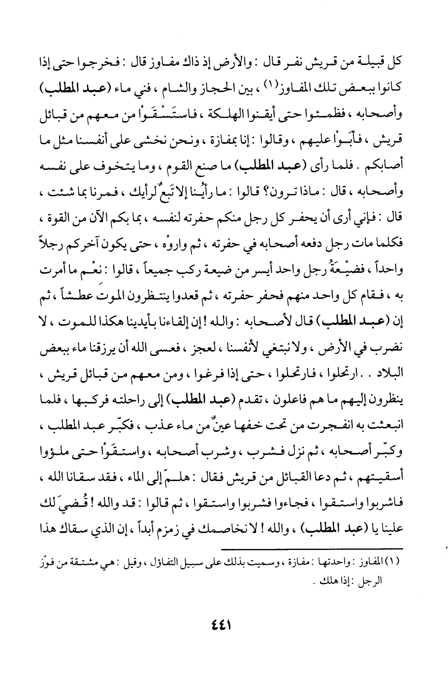 كل قبيلة من قريش نفر قال: والأرض إذ ذاك مفاوز قال: فخرجوا حتى إذا كانوا ببعض تلك المفاوز (¬1)، بين الحجاز والشام، فني ماء (عبد المطلب) وأصحابه، فظمئوا حتى أيقنوا الهلكة، فاستَسْقَوْا من معهم من قبائل قريش، فأبَوْا عليهم، وقالوا: إنا بمفازة، ونحن نخشى على أنفسنا مثل ما أصابكم. فلما رأى (عبد المطلب) ما صنع القوم، وما يتخوف على نفسه وأصحابه، قال: ماذا ترون؟ قالوا: ما رأيُنا إلا تَبعٌ لرأيك، فمرنا بما شئت، قال: فإني أرى أن يحفر كل رجل منكم حفرته لنفسه، بما بكم الآن من القوة، فكلما مات رجل دفعه أصحابه في حفرته، ثم واروْه، حتى يكون آخركم رجلاً واحداً، فضيْعَةُ رجل واحد أيسر من ضيعة ركب جميعاً، قالوا: نِعْم ما أمرت به، فقام كل واحد منهم فحفر حفرته، ثم قعدوا ينتظرون الموت عطشاً، ثم إن (عبد المطلب) قال لأصحابه: والله! إن إلقاءنا بأيدينا هكذا للموت، لا نضرب في الأرض، ولا نبتغي لأنفسنا، لعجز، فعسى الله أن يرزقنا ماء ببعض البلاد .. ارتحلوا، فارتحلوا، حتى إذا فرغوا، ومن معهم من قبائل قريش، ينظرون إليهم ما هم فاعلون، تقدم (عبد المطلب) إلى راحلته فركبها، فلما انبعثت به انفجرت من تحت خفها عينٌ من ماء عذب، فكبّر عبد المطلب، وكبّر أصحابه، ثم نزل فشرب، وشرب أصحابه، واستقَوْا حتى ملؤوا أسقيتهم، ثم دعا القبائل من قريش فقال: هلمّ إلى الماء، فقد سقانا الله، فاشربوا واستقوا، فجاءوا فشربوا واستقوا، ثم قالوا: قد والله! قُضيَ لك علينا يا (عبد المطلب)، والله! لا نخاصمك في زمزم أبداً، إن الذي سقاك هذا