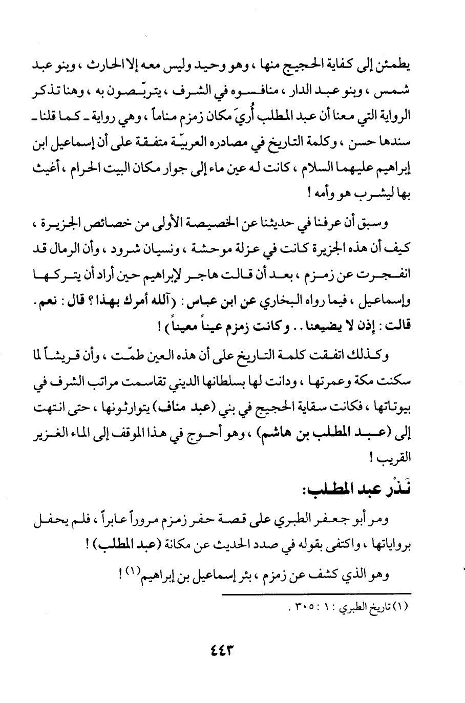 يطمئن إلى كفاية الحجيج منها، وهو وحيد وليس معه إلا الحارث، وينو عبد شمس، وبنو عبد الدار، منافسوه في الشرف، يتربّصون به، وهنا تذكر الرواية التي معنا أن عبد المطلب أُريَ مكان زمزم مناماً، وهي رواية -كما قلنا- سندها حسن، وكلمة التاريخ في مصادره العربيّة متفقة على أن إسماعيل ابن إبراهيم عليهما السلام، كانت له عين ماء إلى جوار مكان البيت الحرام، أغيث بها ليشرب هو وأمه!
