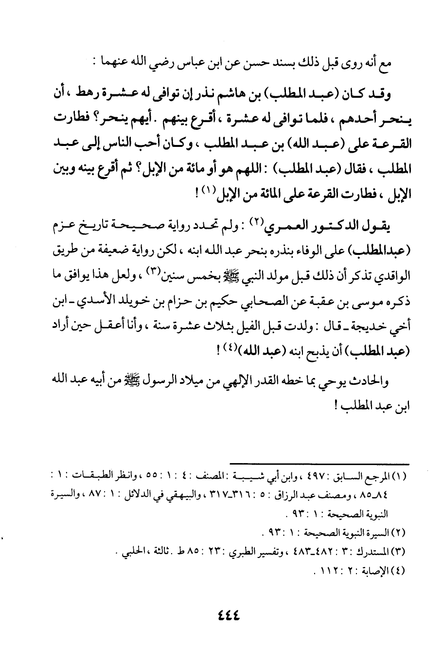 وقد كان (عبد المطلب) بن هاشم نذر إن توافى له عشرة رهط، أن ينحر أحدهم، فلما توافى له عشرة، أقرع بينهم. أيهم ينحر؟ فطارت القرعة على (عبد الله) بن عبد المطلب، وكان أحب الناس إلى عبد المطلب، فقال (عبد المطلب): اللهم هو أو مائة من الإبل؟ ثم أقرع بينه وبين الإبل، فطارت القرعة على المائة من الإبل (¬1)!