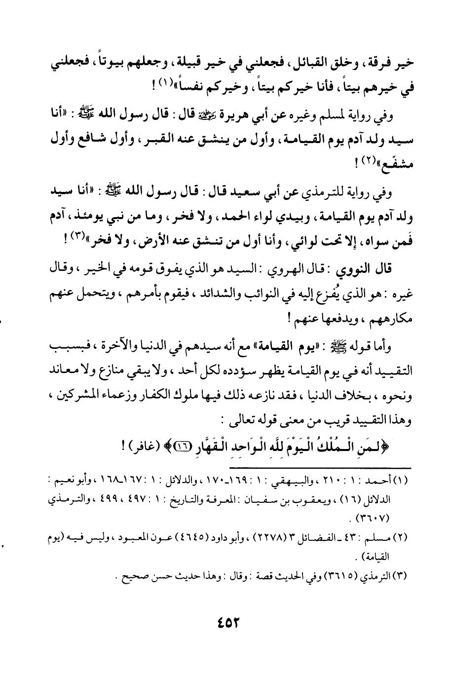 وأما قوله - صلى الله عليه وسلم -: "يوم القيامة" مع أنه سيدهم في الدنيا والآخرة، فبسبب التقييد أنه في يوم القيامة يظهر سؤدده لكل أحد، ولا يبقي منازع ولا معاند ونحوه، بخلاف الدنيا، فقد نازعه ذلك فيها ملوك الكفار وزعماء المشركين، وهذا التقييد قريب من معنى قوله تعالى: {لِمَنِ الْمُلْكُ الْيَوْمَ لِلَّهِ الْوَاحِدِ الْقَهَّارِ (16)} [غافر]!