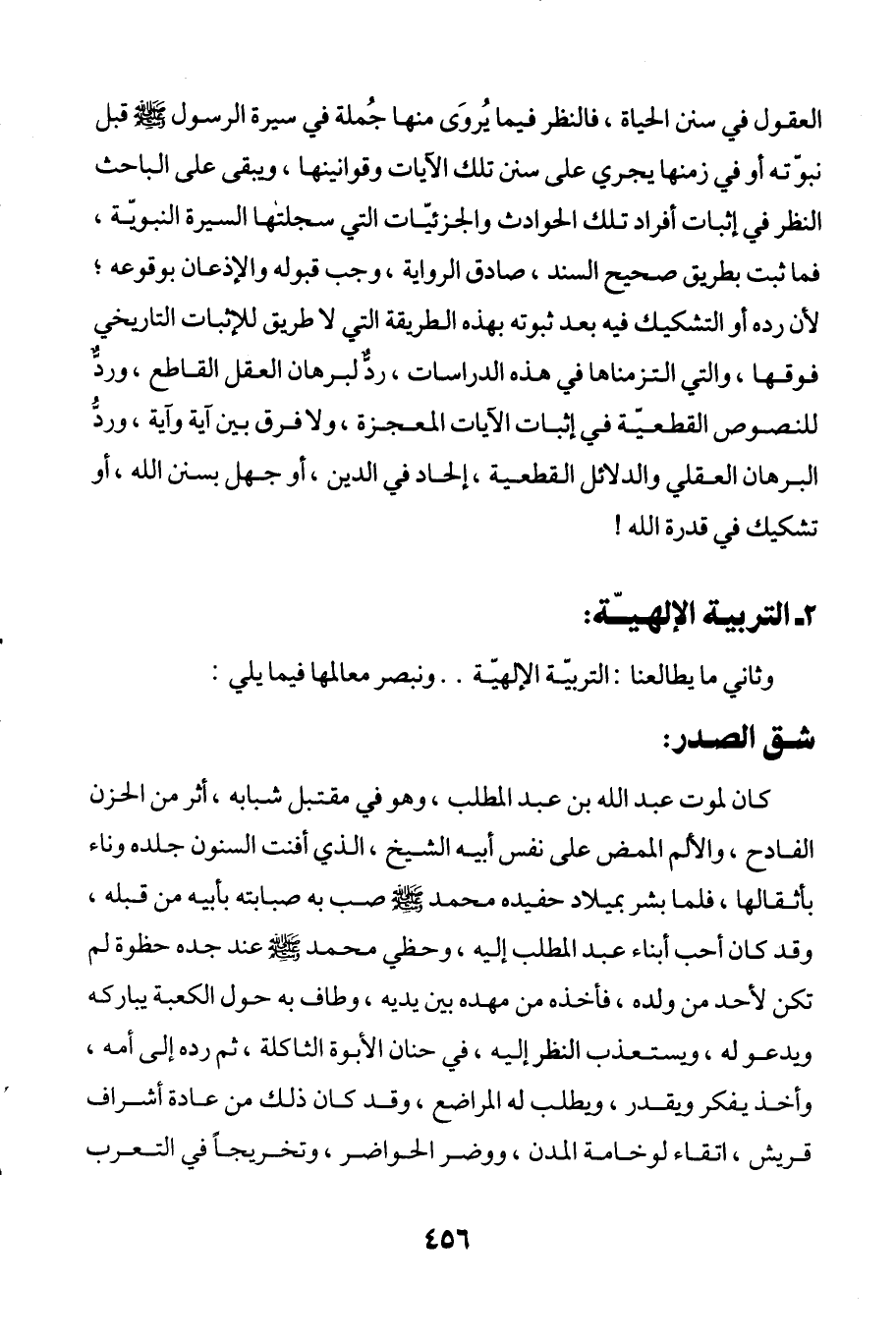 العقول في سنن الحياة، فالنظر فيما يُروَى منها جُملة في سيرة الرسول - صلى الله عليه وسلم - قبل نبوّته أو في زمنها يجري على سنن تلك الآيات وقوانينها، ويبقى على الباحث النظر في إثبات أفراد تلك الحوادث والجزئيّات التي سجلتها السيرة النبويّة، فما ثبت بطريق صحيح السند، صادق الرواية، وجب قبوله والإذعان بوقوعه؛ لأن رده أو التشكيك فيه بعد ثبوته بهذه الطريقة التي لا طريق للإثبات التاريخي فوقها، والتي التزمناها في هذه الدراسات، ردٌّ لبرهان العقل القاطع، وردٌّ للنصوص القطعيّة في إثبات الآيات المعجزة، ولا فرق بين آية وآية، وردُّ البرهان العقلي والدلائل القطعية، إلحاد في الدين، أو جهل بسنن الله، أو تشكيك في قدرة الله!