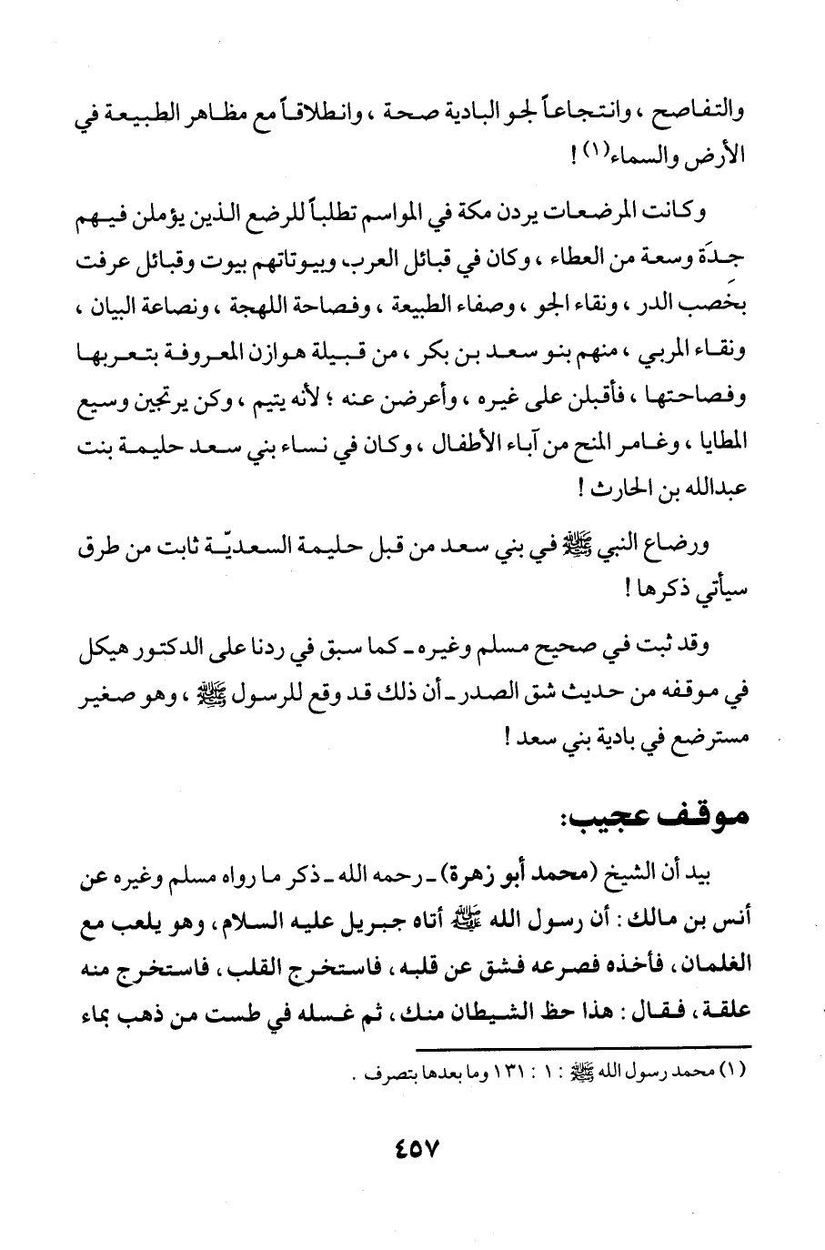 بيد أن الشيخ (محمد أبو زهرة) -رحمه الله- ذكر ما رواه مسلم وغيره عن أنس بن مالك: أن رسول الله - صلى الله عليه وسلم - أتاه جبريل عليه السلام، وهو يلعب مع الغلمان، فأخذه فصرعه فشق عن قلبه، فاستخرج القلب، فاستخرج منه علقة، فقال: هذا حظ الشيطان منك، ثم غسله في طست من ذهب بماء