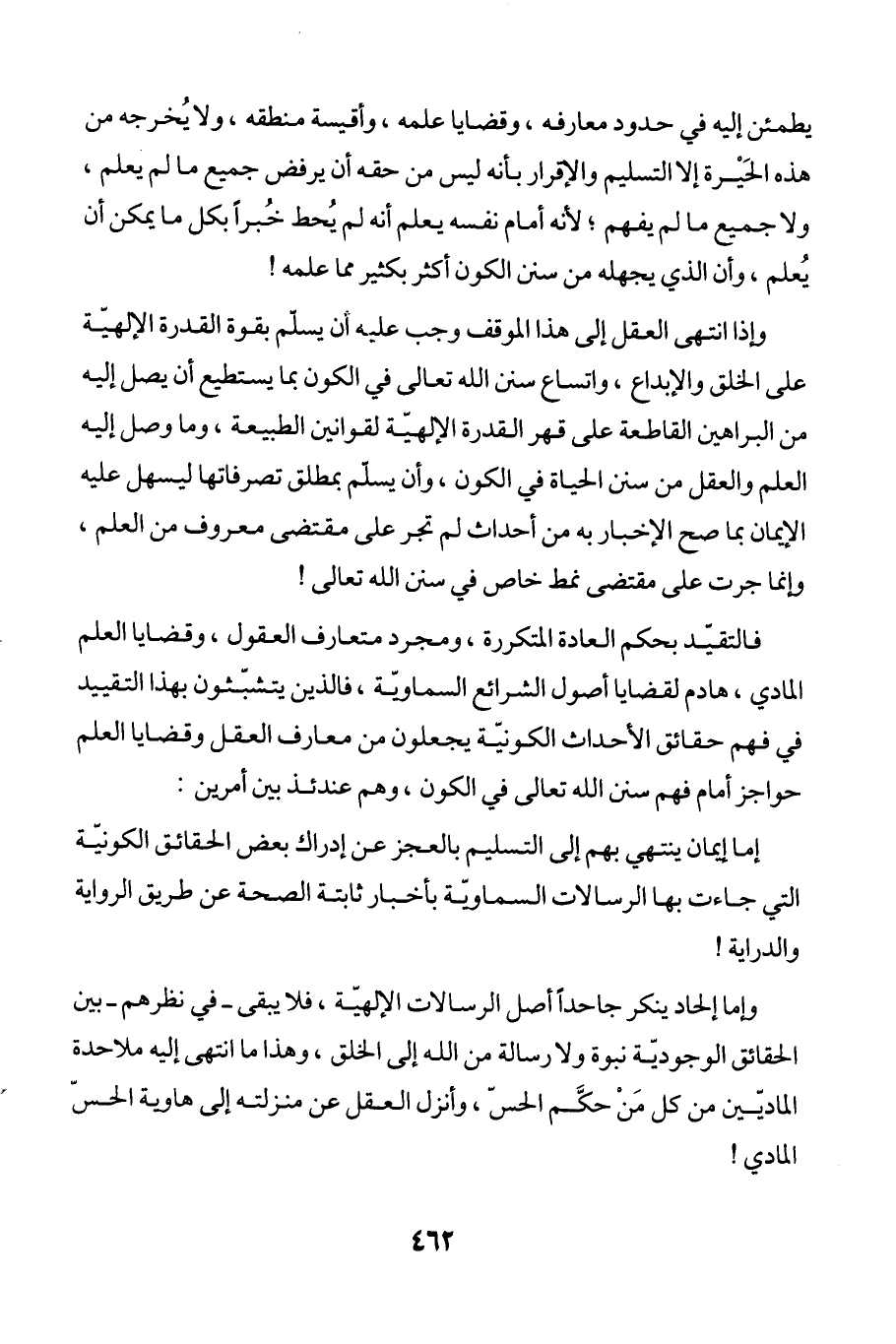 يطمئن إليه في حدود معارفه، وقضايا علمه، وأقيسة منطقه، ولا يُخرجه من هذه الحَيْرة إلا التسليم والإقرار بأنه ليس من حقه أن يرفض جميع ما لم يعلم، ولا جميع ما لم يفهم؛ لأنه أمام نفسه يعلم أنه لم يُحط خُبراً بكل ما يمكن أن يُعلم، وأن الذي يجهله من سنن الكون أكثر بكثير مما علمه!