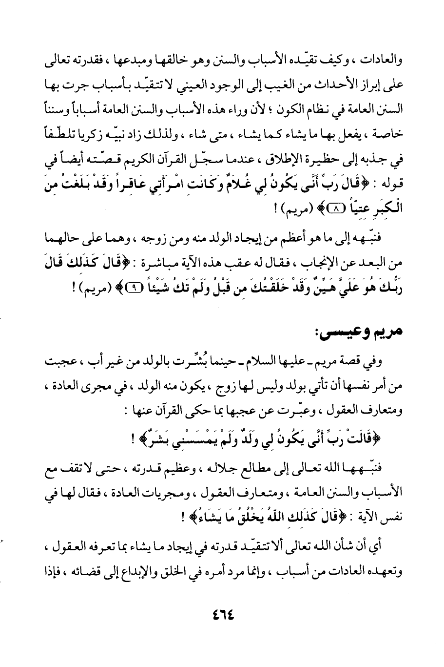والعادات، وكيف تقيّده الأسباب والسنن وهو خالقها ومبدعها، فقدرته تعالى على إبراز الأحداث من الغيب إلى الوجود العيني لا تتقيد بأسباب جرت بها السنن العامة في نظام الكون؛ لأن وراء هذه الأسباب والسنن العامة أسباباً وسنناً خاصة، يفعل بها ما يشاء كما يشاء، متى شاء، ولذلك زاد نبيّه زكريا تلطّفاً في جذبه إلى حظيرة الإطلاق، عندما سجّل القرآن الكريم قصّته أيضاً في قوله: {قَالَ رَبِّ أَنَّى يَكُونُ لِي غُلَامٌ وَكَانَتِ امْرَأَتِي عَاقِرًا وَقَدْ بَلَغْتُ مِنَ الْكِبَرِ عِتِيًّا (8)} (مريم)!