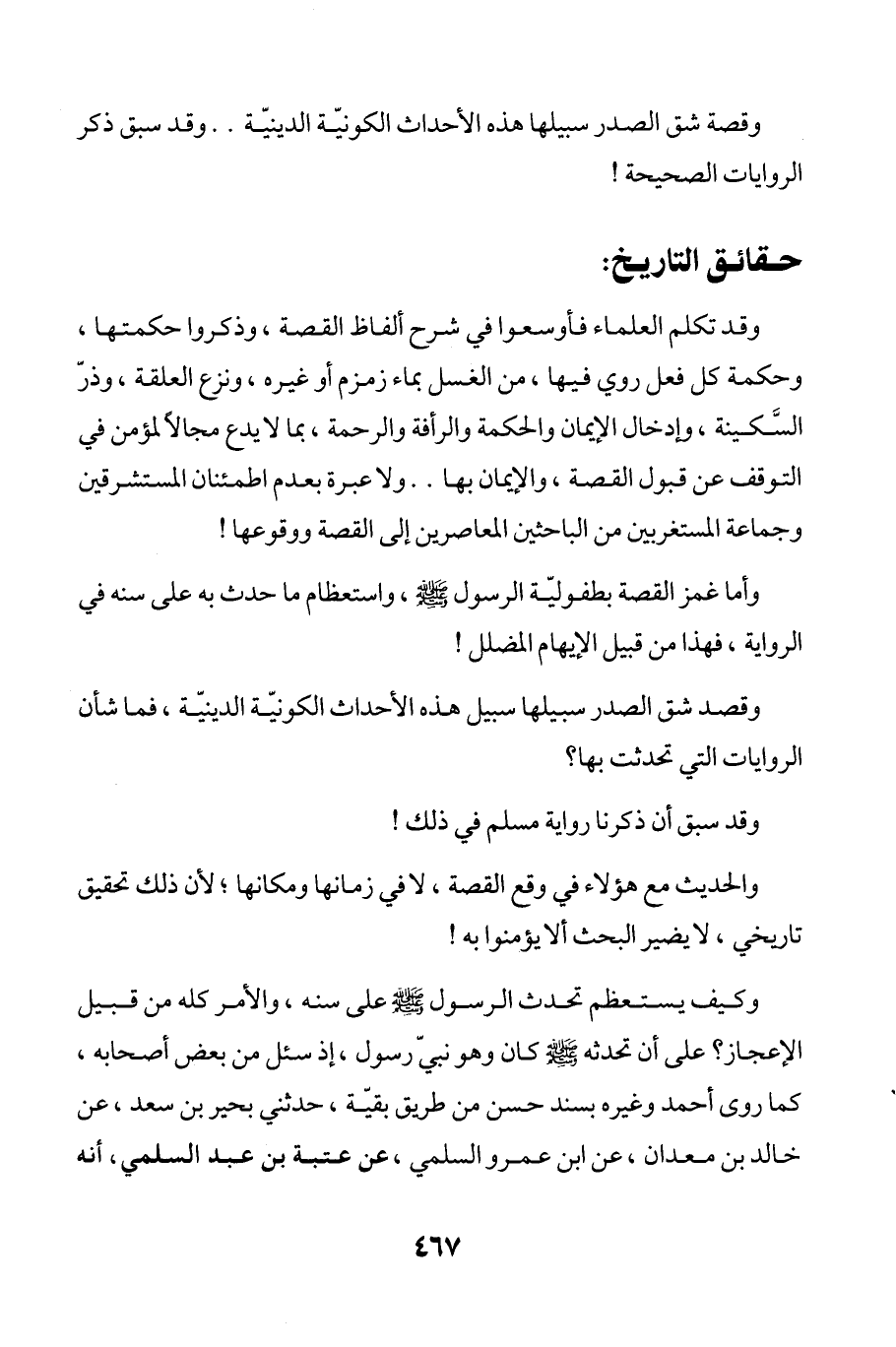وقد تكلم العلماء فأوسعوا في شرح ألفاظ القصة، وذكروا حكمتها، وحكمة كل فعل روي فيها، من الغسل بماء زمزم أو غيره، ونزع العلقة، وذرّ السَّكينة، وإدخال الإيمان والحكمة والرأفة والرحمة، بما لا يدع مجالاً لمؤمن في التوقف عن قبول القصة، والإيمان بها .. ولا عبرة بعدم اطمئنان المستشرقين وجماعة المستغربين من الباحثين المعاصرين إلى القصة ووقوعها!
