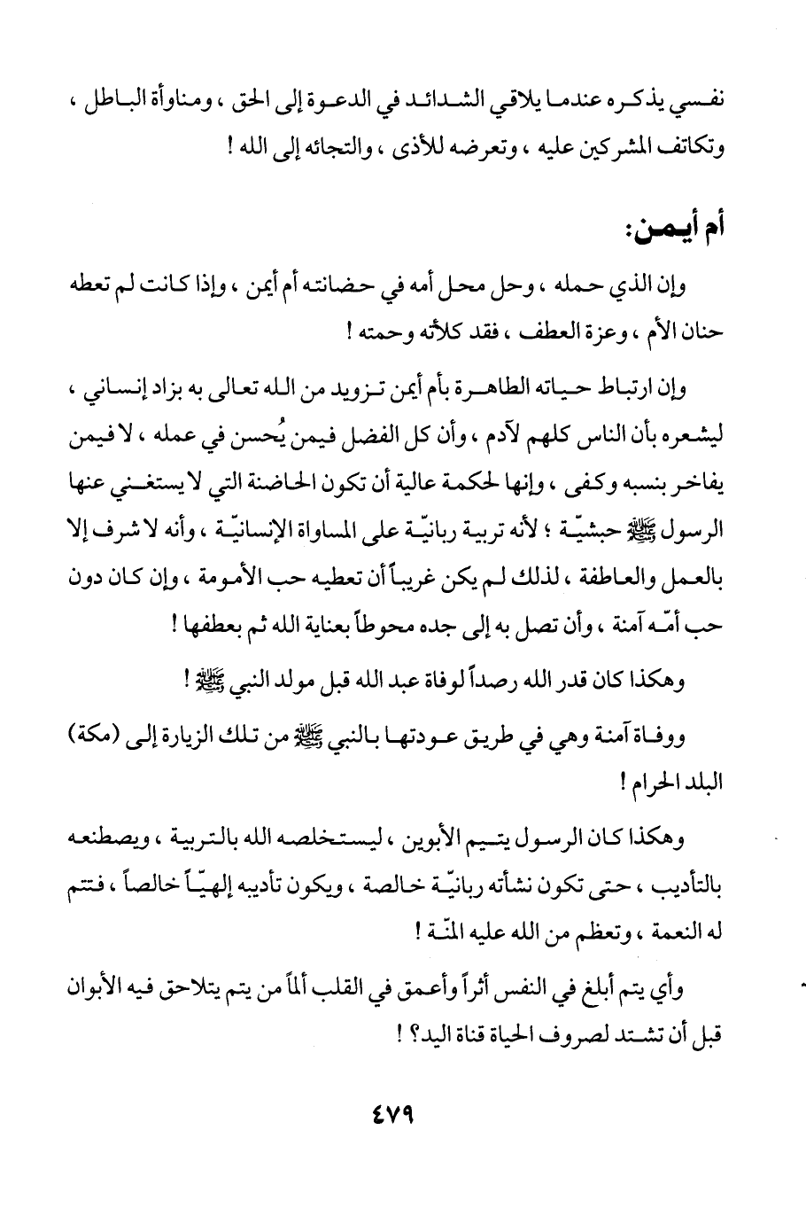 وإن الذي حمله، وحل محل أمه في حضانته أم أيمن، وإذا كانت لم تعطه حنان الأم، وعزة العطف، فقد كلأته وحمته!