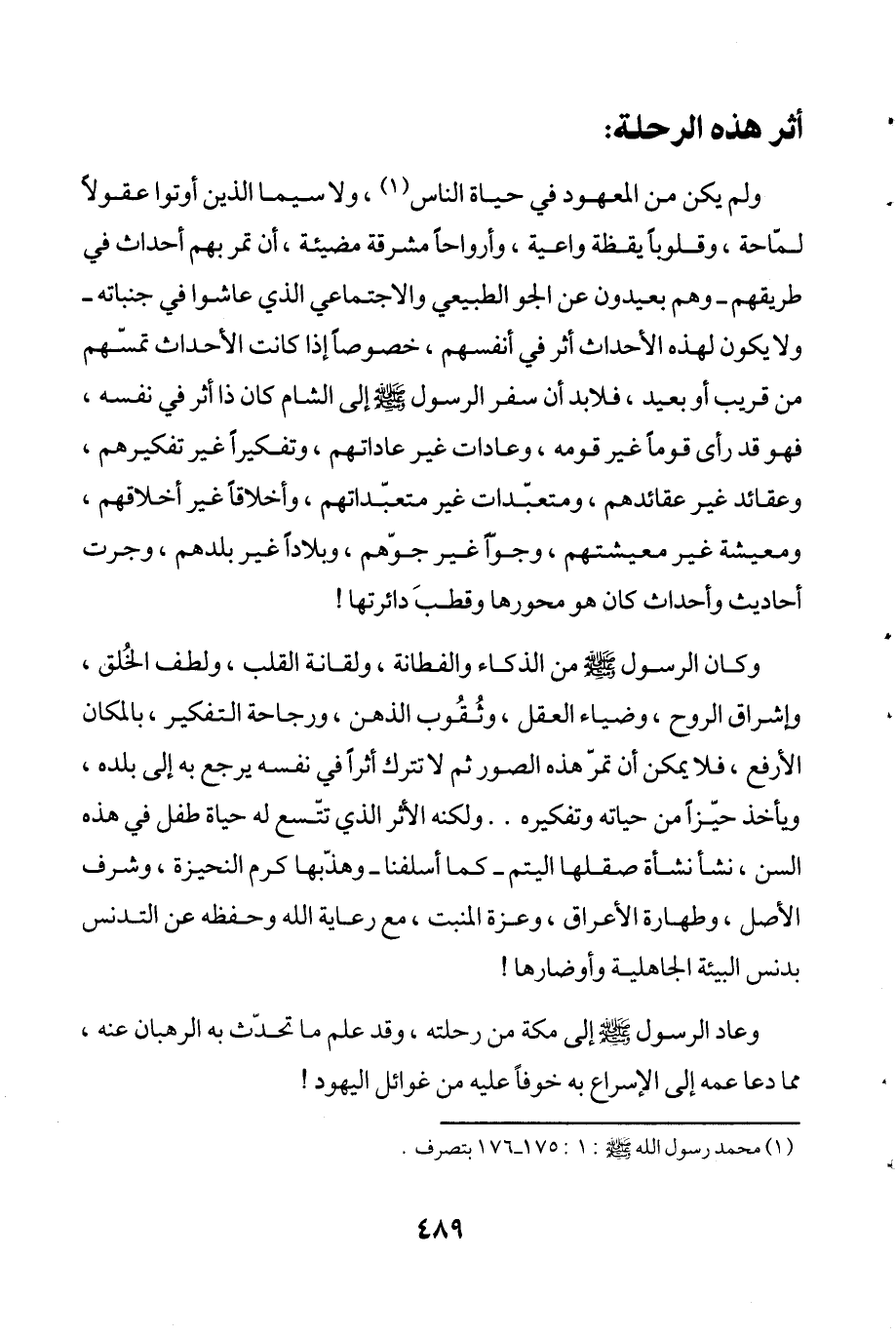 ولم يكن من المعهود في حياة الناس (¬1)، ولا سيما الذين أوتوا عقولاً لمّاحة، وقلوباً يقظة واعية، وأرواحاً مشرقة مضيئة، أن تمر بهم أحداث في طريقهم -وهم بعيدون عن الجو الطبيعي والاجتماعي الذي عاشوا في جنباته- ولا يكون لهذه الأحداث أثر في أنفسهم، خصوصاً إذا كانت الأحداث تمسّهم من قريب أو بعيد، فلابد أن سفر الرسول - صلى الله عليه وسلم - إلى الشام كان ذا أثر في نفسه، فهو قد رأى قوماً غير قومه، وعادات غير عاداتهم، وتفكيراً غير تفكيرهم، وعقائد غير عقائدهم، ومتعبّدات غير متعبّداتهم، وأخلاقاً غير أخلاقهم، ومعيشة غير معيشتهم، وجوًّا غير جوّهم، وبلاداً غير بلدهم، وجرت أحاديث وأحداث كان هو محورها وقطبَ دائرتها!