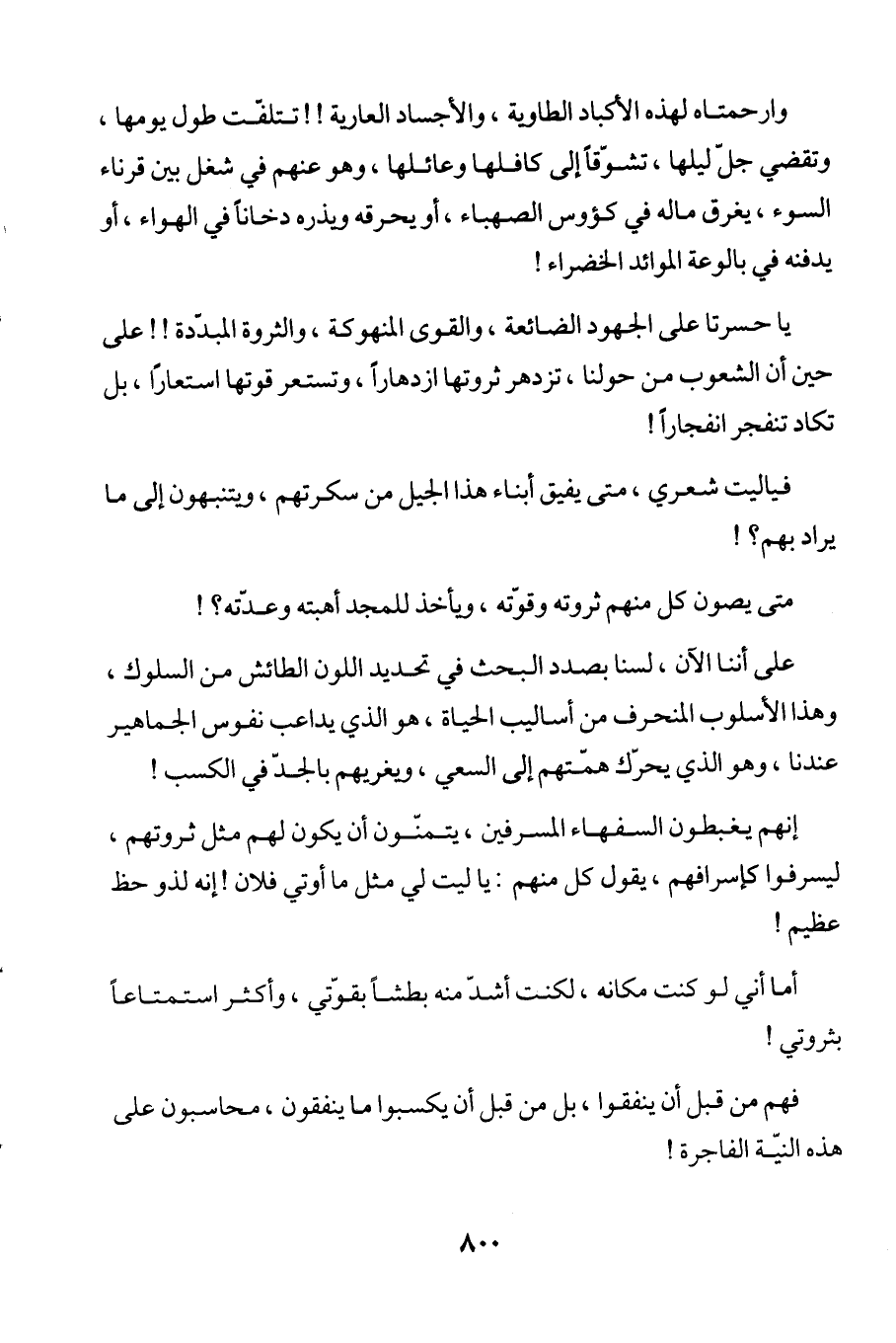 يا حسرتا على الجهود الضائعة، والقوى المنهوكة، والثروة المبدّدة!! على حين أن الشعوب من حولنا، تزدهر ثروتها ازدهاراً، وتستعر قوتها استعارًا، بل تكاد تنفجر انفجاراً!