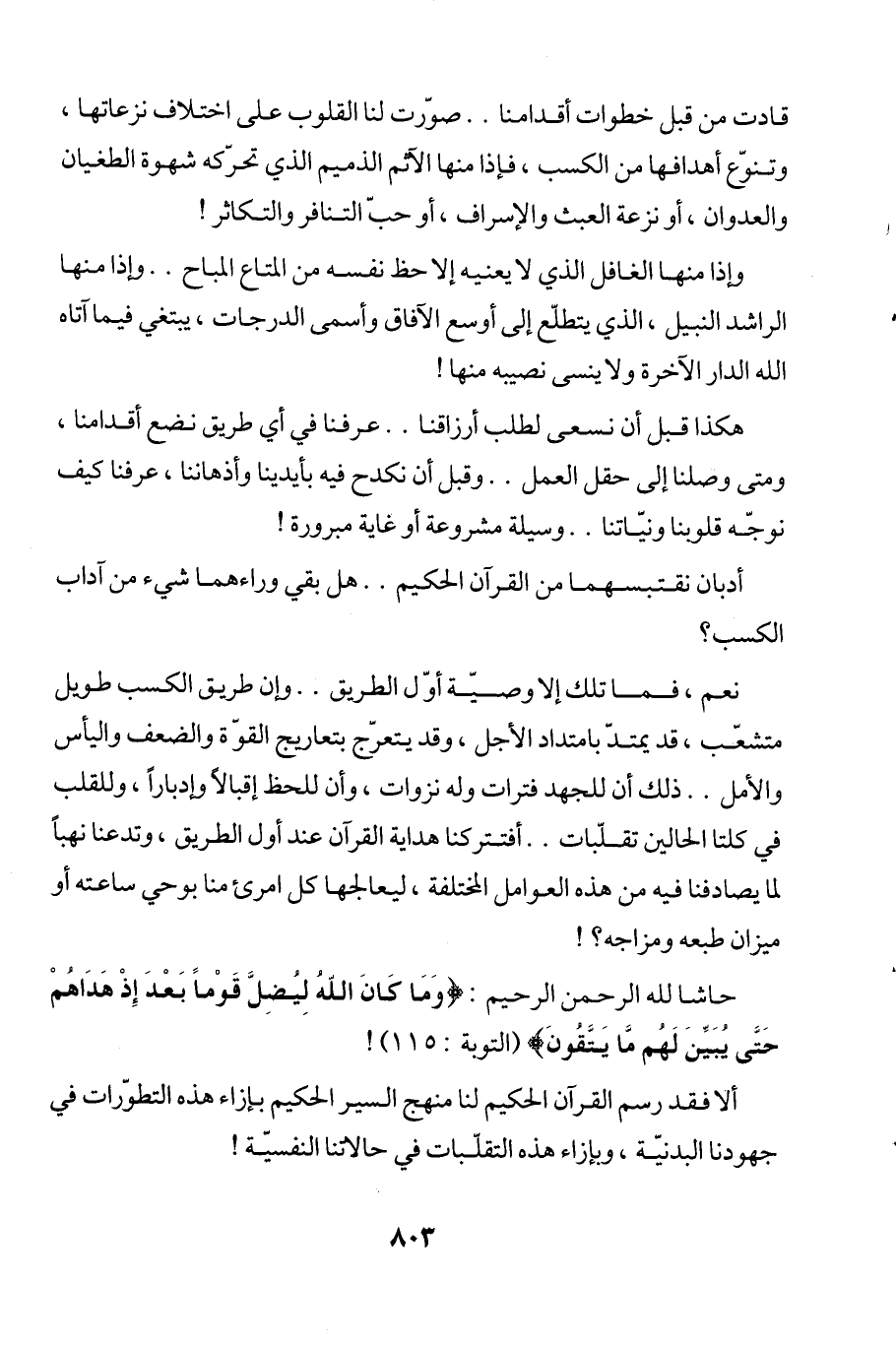نعم، فما تلك إلا وصيّة أوّل الطريق .. وإن طريق الكسب طويل متشعّب، قد يمتدّ بامتداد الأجل، وقد يتعرّج بتعاريج القوة والضعف واليأس والأمل .. ذلك أن للجهد فترات وله نزوات، وأن للحظ إقبالاً وإدباراً، وللقلب في كلتا الحالين تقلّبات .. أفتتركنا هداية القرآن عند أول الطريق، وتدعنا نهباً لما يصادفنا فيه من هذه العوامل المختلفة، ليعالجها كل امرئ منا بوحي ساعته أو ميزان طبعه ومزاجه؟!
