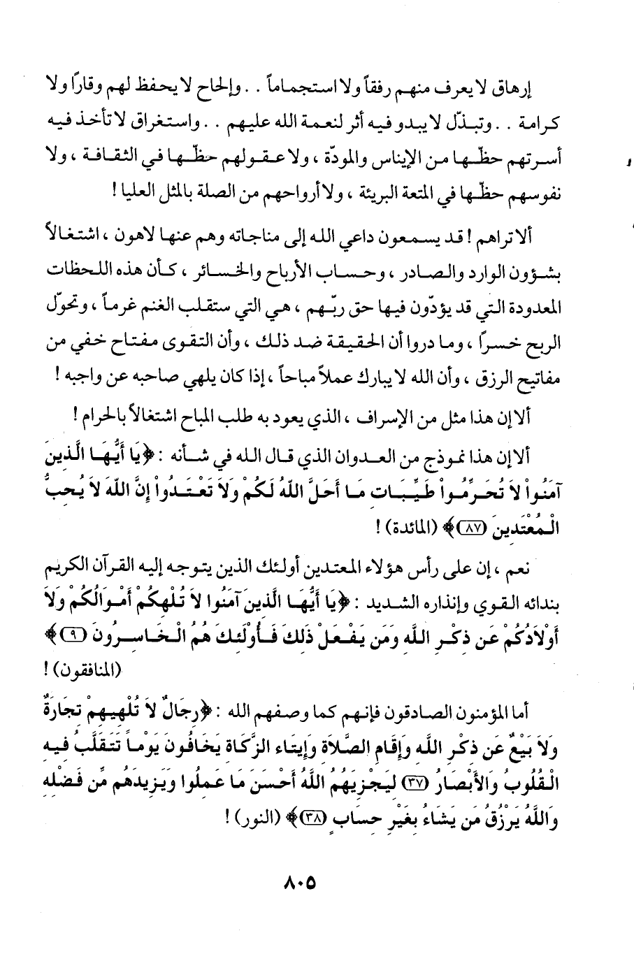 ألا تراهم! قد يسمعون داعي الله إلى مناجاته وهم عنها لاهون، اشتغالاً بشؤون الوارد والصادر، وحساب الأرباح والخسائر، كأن هذه اللحظات المعدودة التي قد يؤدّون فيها حق ربّهم، هي التي ستقلب الغنم غرماً، وتحوّل الربح خسراً، وما دروا أن الحقيقة ضد ذلك، وأن التقوى مفتاح خفي من مفاتيح الرزق، وأن الله لا يبارك عملاً مباحاً، إذا كان يلهي صاحبه عن واجبه!