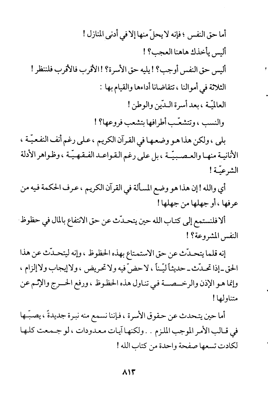 أما حين يتحدث عن حقوق الأسرة، فإننا نسمع منه نبرة جديدةً، يصبّها في قالب الأمر الموجب الملزم .. ولكنها آيات معدودات، لو جمعت كلها لكادت تسعها صفحة واحدة من كتاب الله!