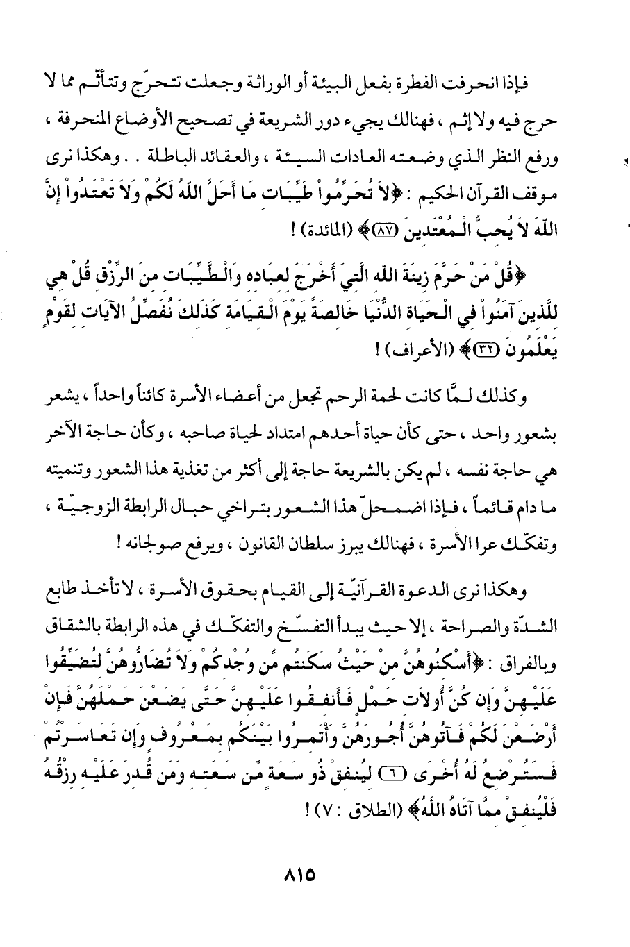 وهكذا نرى الدعوة القرآنيّة إلى القيام بحقوق الأسرة، لا تأخذ طابع الشدّة والصراحة، إلا حيث يبدأ التفسّخ والتفكك في هذه الرابطة بالشقاق وبالفراق: {أَسْكِنُوهُنَّ مِنْ حَيْثُ سَكَنْتُمْ مِنْ وُجْدِكُمْ وَلَا تُضَارُّوهُنَّ لِتُضَيِّقُوا عَلَيْهِنَّ وَإِنْ كُنَّ أُولَاتِ حَمْلٍ فَأَنْفِقُوا عَلَيْهِنَّ حَتَّى يَضَعْنَ حَمْلَهُنَّ فَإِنْ أَرْضَعْنَ لَكُمْ فَآتُوهُنَّ أُجُورَهُنَّ وَأْتَمِرُوا بَيْنَكُمْ بِمَعْرُوفٍ وَإِنْ تَعَاسَرْتُمْ فَسَتُرْضِعُ لَهُ أُخْرَى (6) لِيُنْفِقْ ذُو سَعَةٍ مِنْ سَعَتِهِ وَمَنْ قُدِرَ عَلَيْهِ رِزْقُهُ فَلْيُنْفِقْ مِمَّا آتَاهُ اللَّهُ} (الطلاق: 7)!
