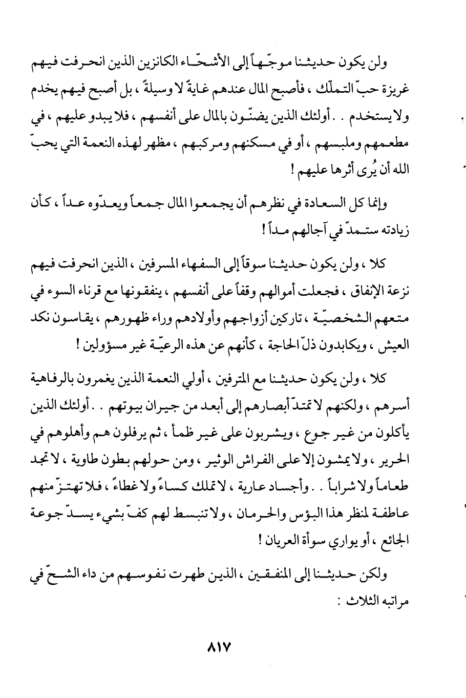 ولن يكون حديثنا موجّهاً إلى الأشحّاء الكانزين الذين انحرفت فيهم غريزة حبّ التملّك، فأصبح المال عندهم غايةً لا وسيلةً، بل أصبح فيهم يخدم ولا يستخدم .. أولئك الذين يضنّون بالمال على أنفسهم، فلا يبدو عليهم، في مطعمهم وملبسهم، أو في مسكنهم ومركبهم، مظهر لهذه النعمة التي يحبّ الله أن يُرى أثرها عليهم!