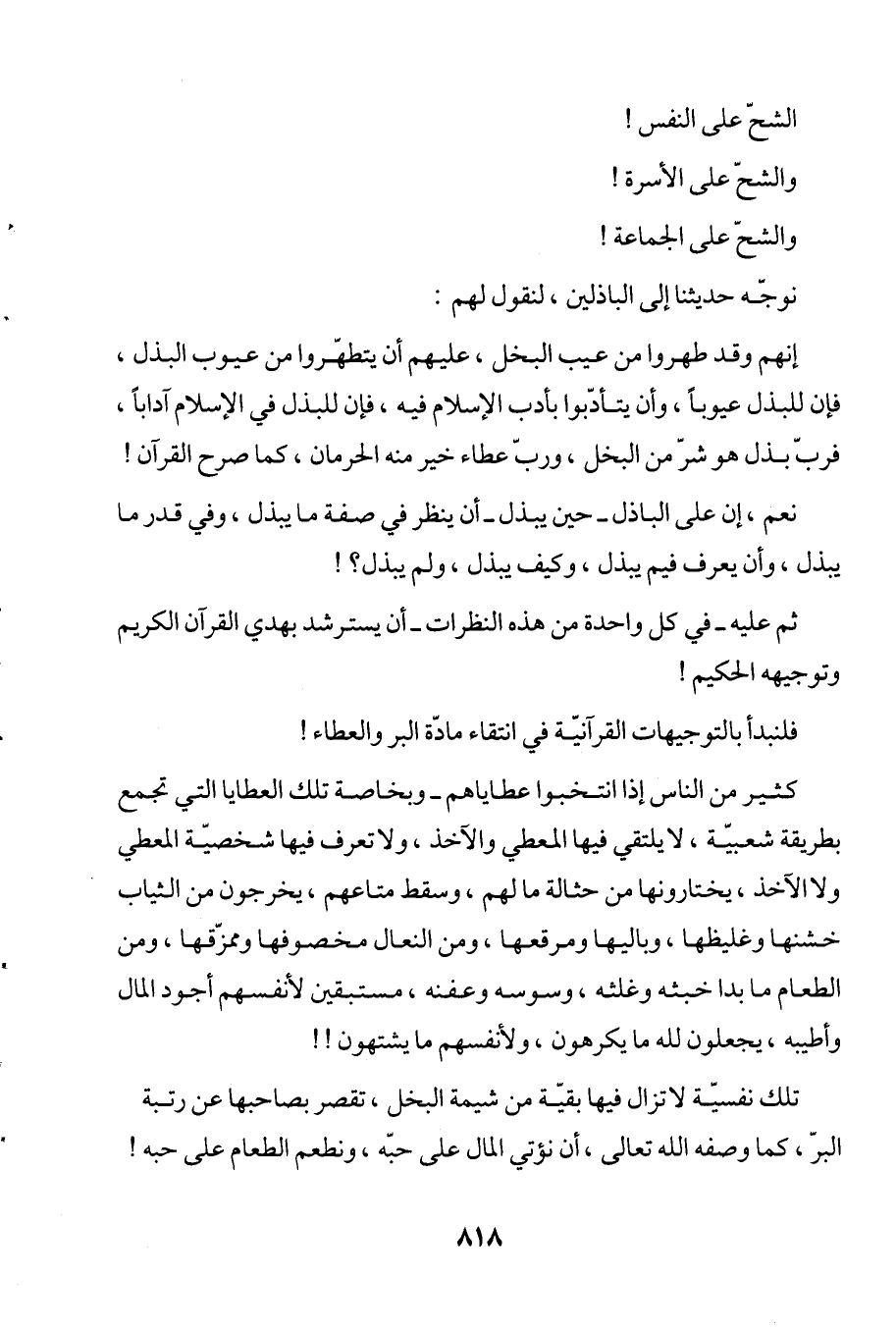 إنهم وقد طهروا من عيب البخل، عليهم أن يتطهّروا من عيوب البذل، فإن للبذل عيوباً، وأن يتأدّبوا بأدب الإسلام فيه، فإن للبذل في الإسلام آداباً، فربّ بذل هو شرّ من البخل، وربّ عطاء خير منه الحرمان، كما صرح القرآن!