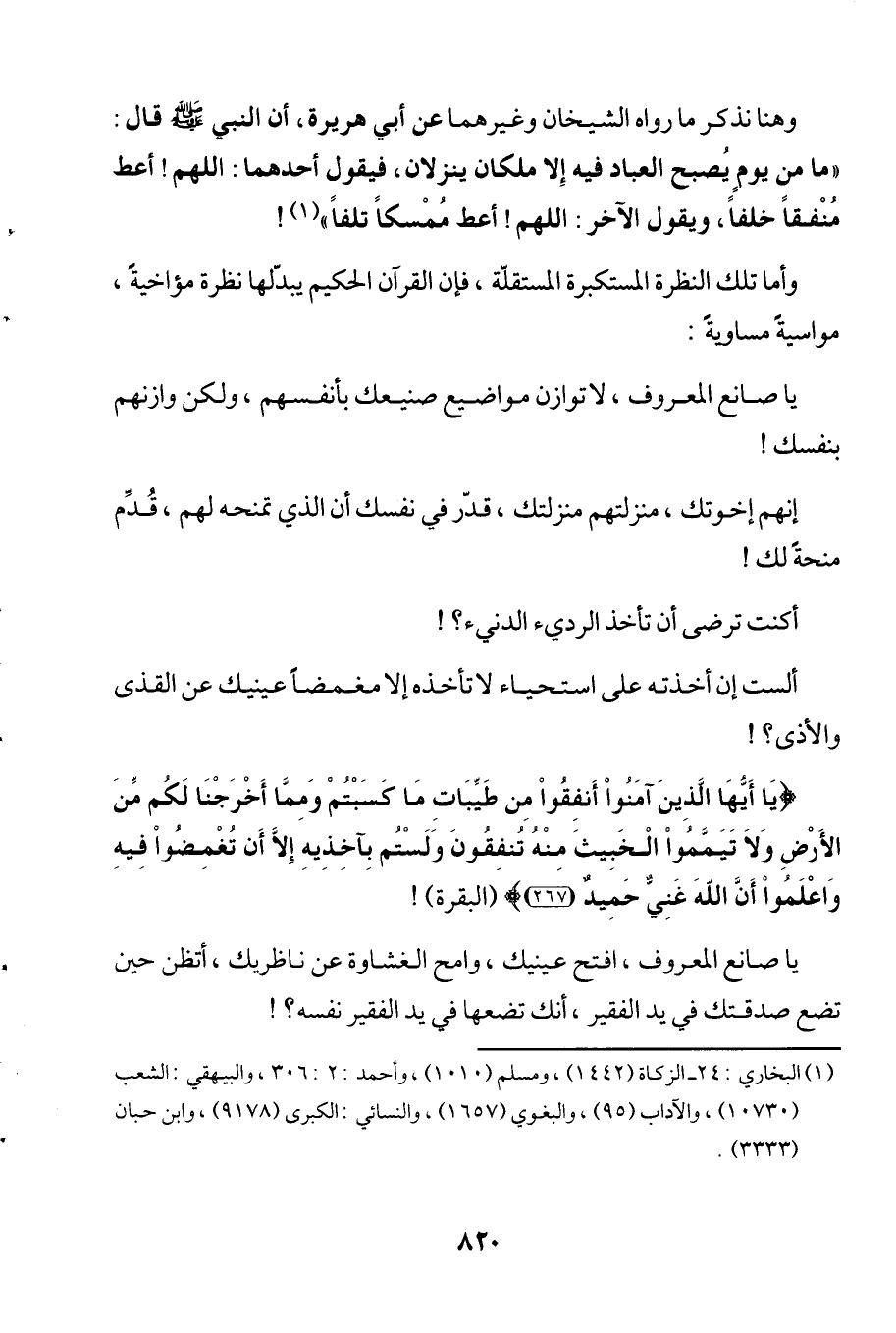 وهنا نذكر ما رواه الشيخان وغيرهما عن أبي هريرة، أن النبي - صلى الله عليه وسلم -قال: "ما من يومٍ يُصبح العباد فيه إِلا ملكان ينزلان، فيقول أحدهما: اللهم! أعط مُنْفقاً خلفاً، ويقول الآخر: اللهم! أعط مُمْسكاً تلفاً" (¬1)!