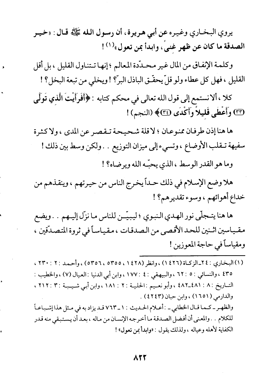 يروي البخاري وغيره عن أبي هريرة، أن رسول الله - صلى الله عليه وسلم - قال: "خير الصدقة ما كان عن ظهر غِنىً، وابدأ بمن تعول" (¬1)!