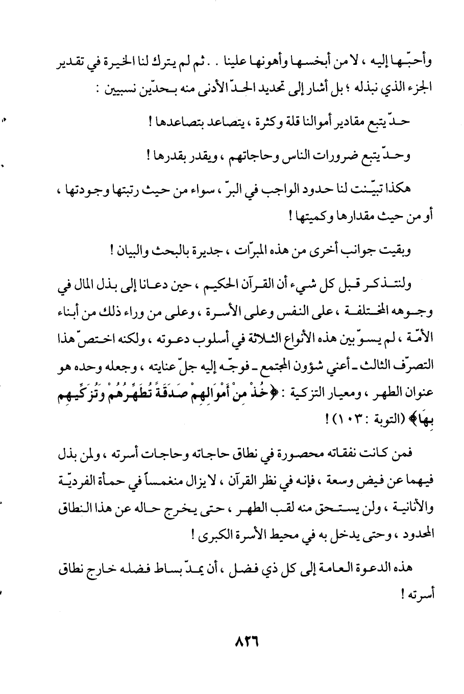 ولنتذكر قبل كل شيء أن القرآن الحكيم، حين دعانا إلى بذل المال في وجوهه المختلفة، على النفس وعلى الأسرة، وعلى من وراء ذلك من أبناء الأمّة، لم يسوّ بين هذه الأنواع الثلاثة في أسلوب دعوته، ولكنه اختصّ هذا التصرّف الثالث -أعني شؤون المجتمع- فوجّه إليه جلّ عنايته، وجعله وحده هو عنوان الطهر، ومعيار التزكية: {خُذْ مِنْ أَمْوَالِهِمْ صَدَقَةً تُطَهِّرُهُمْ وَتُزَكِّيهِمْ بِهَا} (التوبة: 103)!
