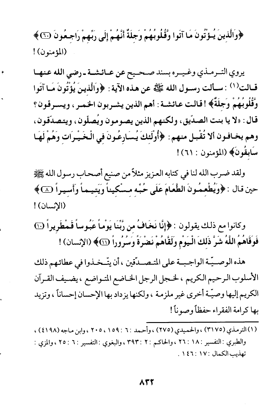 يروي الترمذي وغيره بسند صحيح عن عائشة -رضي الله عنها قالت (¬1): سألت رسول الله - صلى الله عليه وسلم - عن هذه الآية: {وَالَّذِينَ يُؤْتُونَ مَا آتَوْا وَقُلُوبُهُمْ وَجِلَةٌ}! قالت عائشة: أهم الذين يشربون الخمر, ويسرقون؟ قال: "لا يا بنت الصدّيق, ولكنهم الذين يصومون ويُصلّون ويتصدّقون, وهم يخافون ألا تُقْبل منهم: {أُولَئِكَ يُسَارِعُونَ فِي الْخَيْرَاتِ وَهُمْ لَهَا سَابِقُونَ} (المؤمنون: 61)!