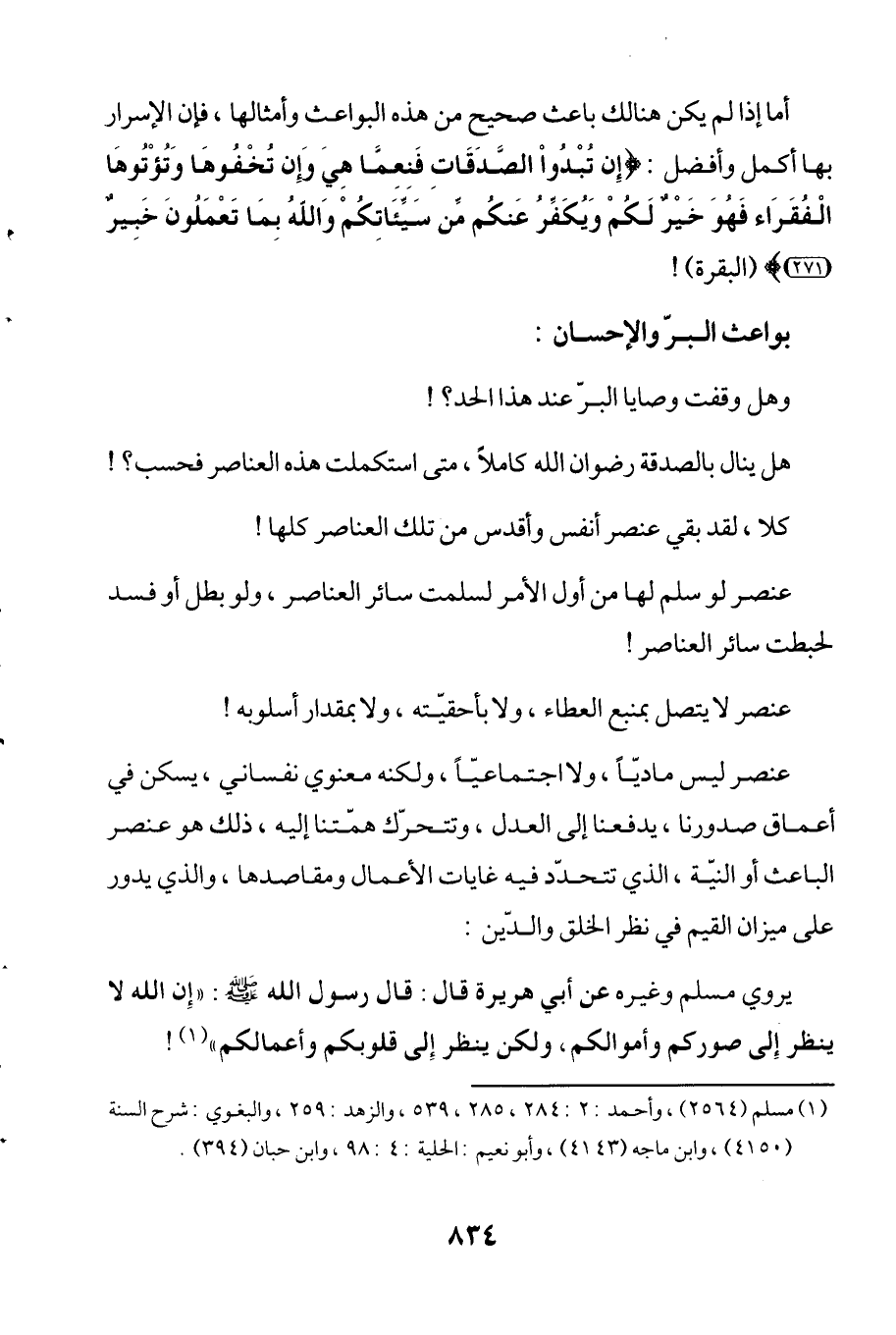 عنصر ليس ماديًّا، ولا اجتماعيًّا، ولكنه معنوي نفساني، يسكن في أعماق صدورنا، يدفعنا إلى العدل، وتتحرّك همّتنا إليه، ذلك هو عنصر الباعث أو النيّة، الذي تتحدّد فيه غايات الأعمال ومقاصدها، والذي يدور على ميزان القيم في نظر الخلق والدّين: