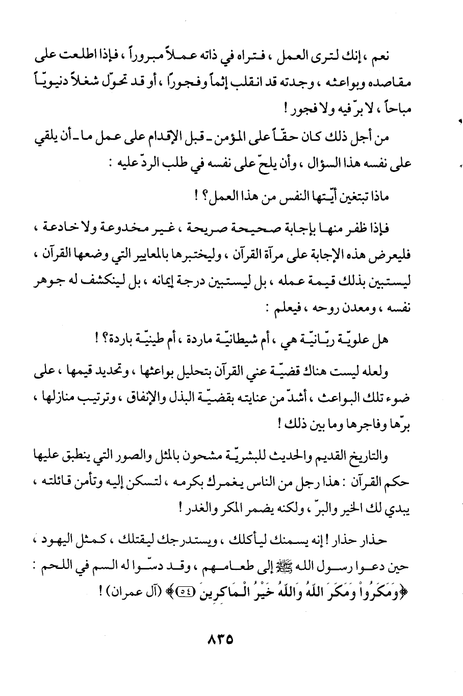 فإذا ظفر منها بإجابة صحيحة صريحة، غير مخدوعة ولا خادعة، فليعرض هذه الإجابة على مرآة القرآن، وليختبرها بالمعايير التي وضعها القرآن، ليستبين بذلك قيمة عمله، بل ليستبين درجة ايمانه، بل لينكشف له جوهر نفسه، ومعدن روحه، فيعلم: