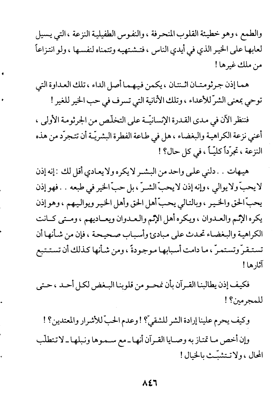 هما إذن جرثومتان اثنتان، يكمن فيهما أصل الداء، تلك العداوة التي توحي بمعنى الشر للأعداء، وتلك الأنانية التي تسرف في حب الخير للغير!