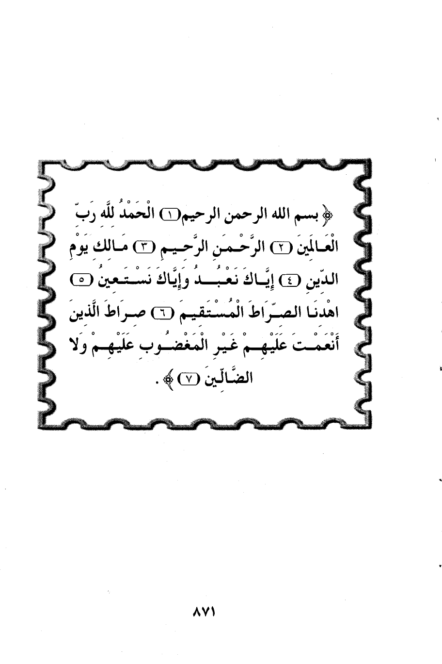 {بِسْمِ اللهِ الرَّحْمَنِ الرَّحِيمِ (1) الْحَمْدُ لِلَّهِ رَبِّ الْعَالَمِينَ (2) الرَّحْمَنِ الرَّحِيمِ (3) مَالِكِ يَوْمِ الدِّينِ (4) إِيَّاكَ نَعْبُدُ وَإِيَّاكَ نَسْتَعِينُ (5) اهْدِنَا الصِّرَاطَ الْمُسْتَقِيمَ (6) صِرَاطَ الَّذِينَ أَنْعَمْتَ عَلَيْهِمْ غَيْرِ الْمَغْضُوبِ عَلَيْهِمْ وَلَا الضَّالِّينَ (7)}