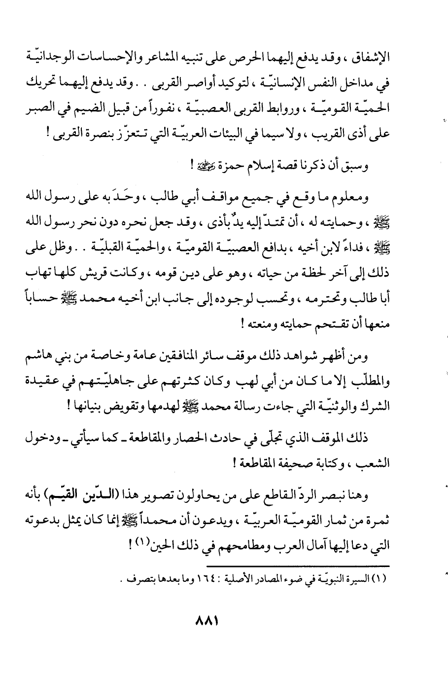وهنا نبصر الردّ القاطع على من يحاولون تصوير هذا (الدّين القيّم) بأنه ثمرة من ثمار القوميّة العربيّة، ويدعون أن محمداً - صلى الله عليه وسلم - إنما كان يمثل بدعوته التي دعا إليها آمال العرب ومطامحهم في ذلك الحين (¬1)!