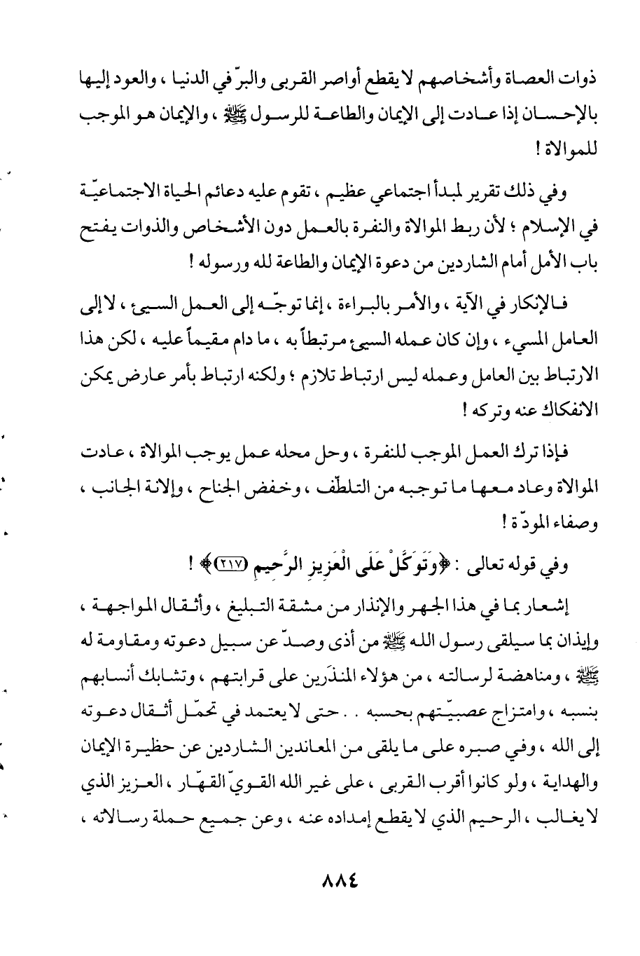 وفي ذلك تقرير لمبدأ اجتماعي عظيم، تقوم عليه دعائم الحياة الاجتماعيّة في الإسلام؛ لأن ربط الموالاة والنفرة بالعمل دون الأشخاص والذوات يفتح باب الأمل أمام الشاردين من دعوة الإيمان والطاعة لله ورسوله!