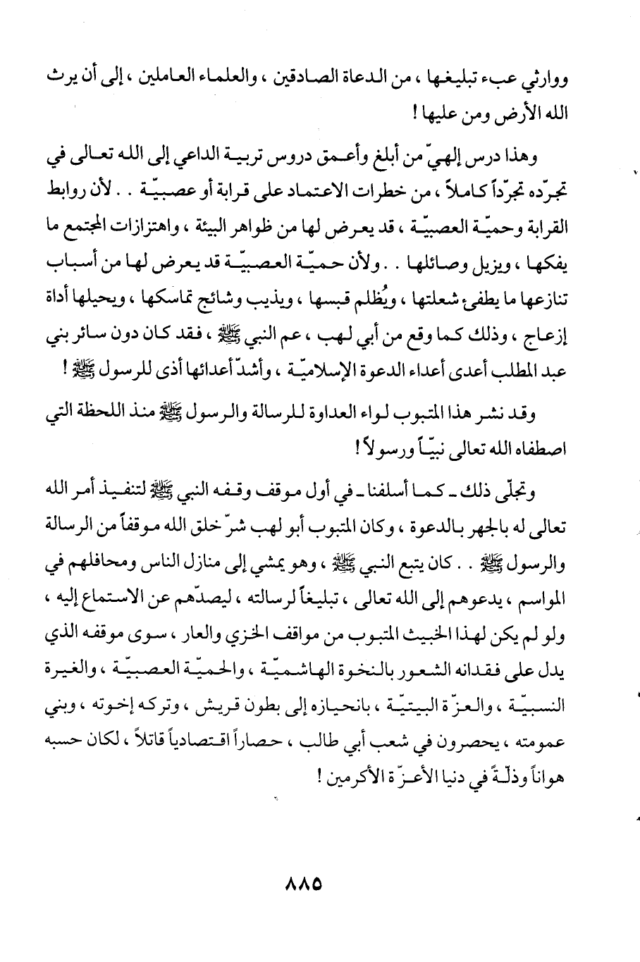 وهذا درس إلهيّ من أبلغ وأعمق دروس تربية الداعي إلى الله تعالى في تجرده تجرداً كاملاً، من خطرات الاعتماد على قرابة أو عصبيّة .. لأن روابط القرابة وحميّة العصبيّة، قد يعرض لها من ظواهر البيئة، واهتزازات المجتمع ما يفكها، ويزيل وصائلها .. ولأن حميّة العصبيّة قد يعرض لها من أسباب تنازعها ما يطفئ شعلتها، ويُظلم قبسها، ويذيب وشائج تماسكها، ويحيلها أداة إزعاج، وذلك كما وقع من أبي لهب، عم النبي - صلى الله عليه وسلم -، فقد كان دون سائر بني عبد المطلب أعدى أعداء الدعوة الإسلاميّة، وأشدّ أعدائها أذى للرسول - صلى الله عليه وسلم -!