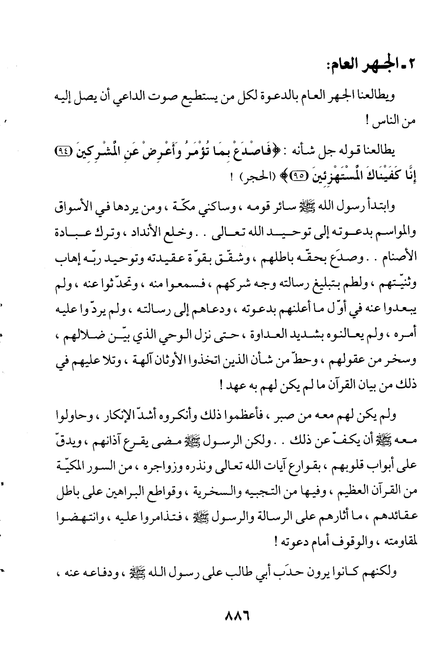 وابتدأ رسول الله - صلى الله عليه وسلم - سائر قومه، وساكني مكّة، ومن يردها في الأسواق والمواسم بدعوته إلى توحيد الله تعالى .. وخلع الأنداد، وترك عبادة الأصنام .. وصدعَ بحقّه باطلهم، وشقّق بقوّة عقيدته وتوحيد ربّه إهاب وثنيّتهم، ولطم بتبليغ رسالته وجه شركهم، فسمعوا منه، وتحدّثوا عنه، ولم يبعدوا عنه في أوّل ما أعلنهم بدعوته، ودعاهم إلى رسالته، ولم يردّوا عليه أمره، ولم يعالنوه بشديد العداوة، حتى نزل الوحي الذي بيّن ضلالهم، وسخر من عقولهم، وحطّ من شأن الذين اتخذوا الأوثان آلهة، وتلا عليهم في ذلك من بيان القرآن ما لم يكن لهم به عهد!