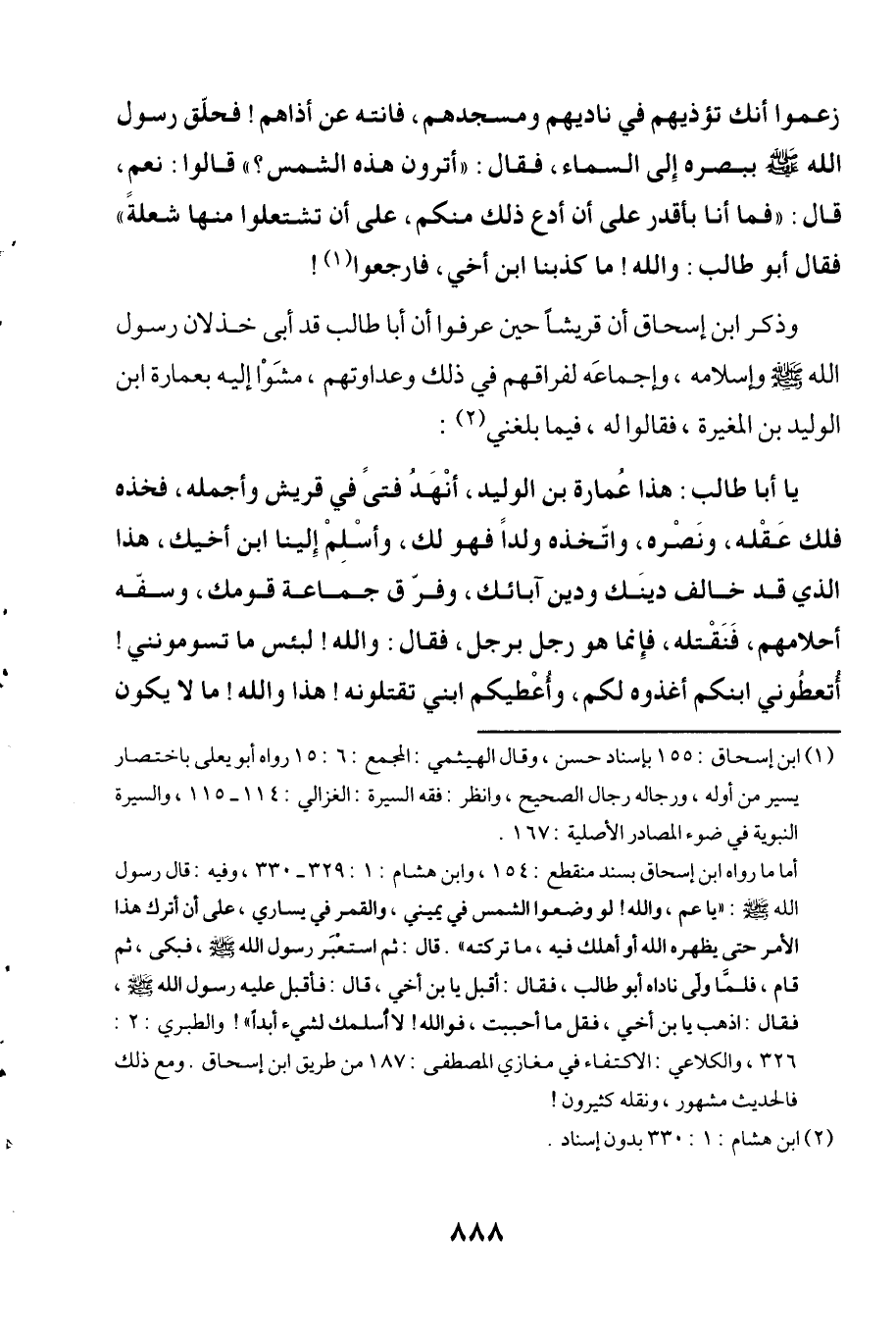 يا أبا طالب: هذا عُمارة بن الوليد، أنْهَدُ فتىً فتىً قريش وأجمله، فخذه ذلك عَقْله، ونَصْره، واتّخذه ولداً فهو لك، وأسْلِمْ إِلينا ابن أخيك، هذا الذي قد خالف دينَك ودين آبائك، وفرّق جماعة قومك، وسفّه أحلامهم، فَنَقْتله، فإِنما هو رجل برجل، فقال: والله! لبئس ما تسومونني! أُتعطُوني ابنكم أغذوه لكم، وأُعْطيكم ابني تقتلونه! هذا والله! ما لا يكون