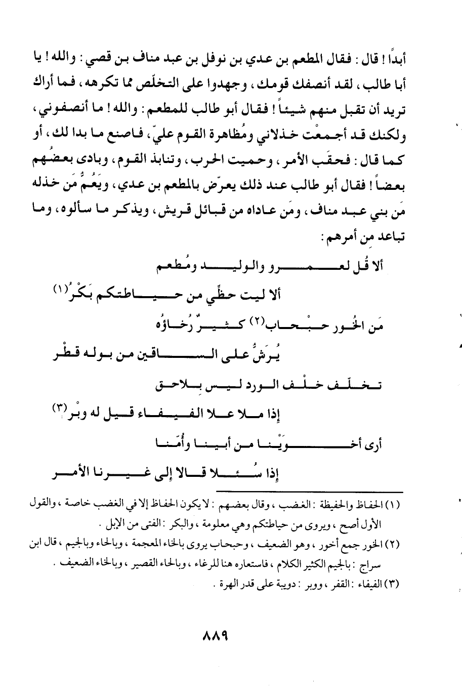 أبدًا! قال: فقال المطعم بن عدي بن نوفل بن عبد مناف بن قصي: والله! يا أبا طالب، لقد أنصفك قومك، وجهدوا على التخلّص مما تكرهه، فما أراك تريد أن تقبل منهم شيئاً! فقال أبو طالب للمطعم: والله! ما أنصفوني، ولكنك قد أجمعْت خذلاني ومُظاهرة القوم عليّ، فاصنع ما بدا لك، أو كما قال: فحقَب الأمر، وحميت الحرب، وتنابذ القوم، وبادى بعضُهم بعضاً! فقال أبو طالب عند ذلك يعرّض بالمطعم بن عدي، ويَعُمُّ مَن خذله مَن بني عبد مناف، ومَن عاداه من قبائل قريش، ويذكر ما سألوه، وما تباعد مِن أمرهم: