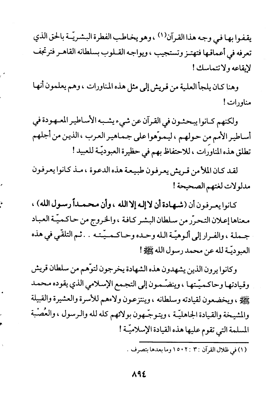 وكانوا يرون الذين يشهدون هذه الشهادة يخرجون لتوّهم من سلطان قريش وقيادتها وحاكميّتها، وينضمّون إلى التجمع الإسلامي الذي يقوده محمد - صلى الله عليه وسلم -، ويخضعون لقيادته وسلطانه، وينتزعون ولاءهم للأسرة والعشيرة والقبيلة والمشيخة والقيادة الجاهليّة، ويتوجّهون بولائهم كله لله والرسول، والعُصْبة المسلمة التي تقوم عليها هذه القيادة الإسلاميّة!
