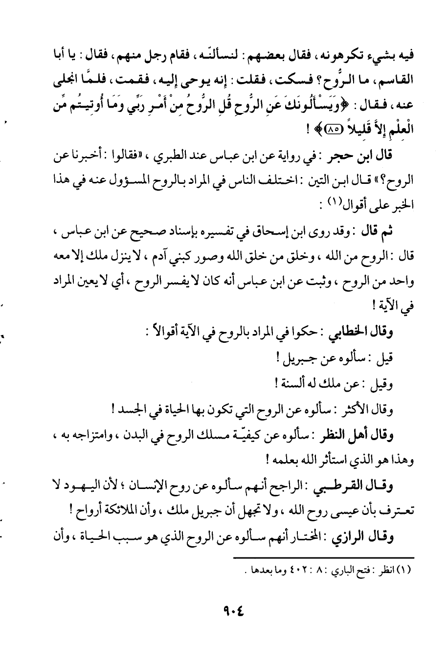 قال ابن حجر: في رواية عن ابن عباس عند الطبري، "فقالوا: أخبرنا عن الروح؟ " قال ابن التين: اختلف الناس في المراد بالروح المسؤول عنه في هذا الخبر على أقوال (¬1):