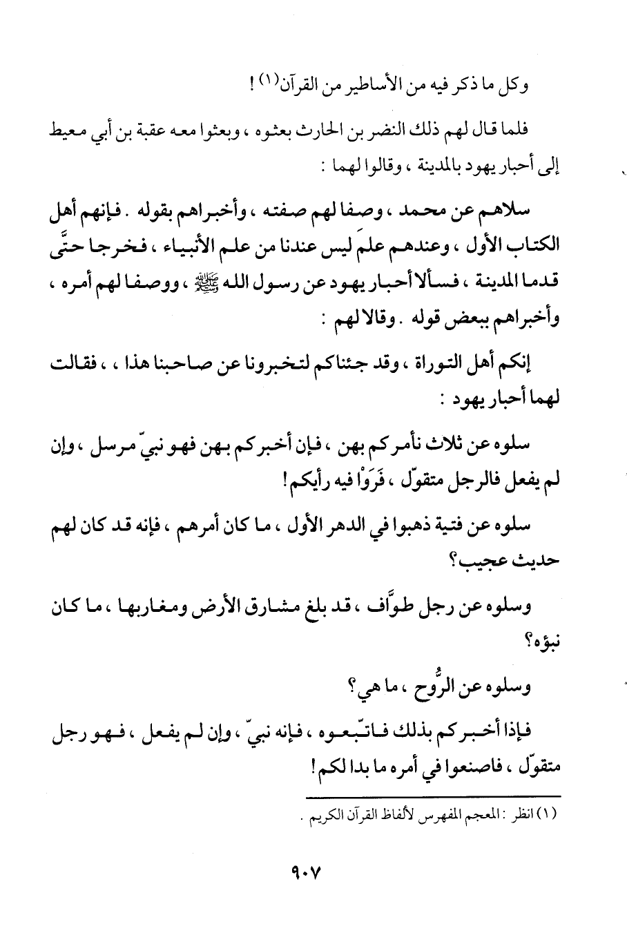 إنكم أهل التوراة، وقد جئناكم لتخبرونا عن صاحبنا هذا،، فقالت لهما أحبار يهود: سلوه عن ثلاث نأمركم بهن، فإن أخبركم بهن فهو نبيّ مرسل، وإن لم يفعل فالرجل متقوّل، فَرَوْا فيه رأيكم!