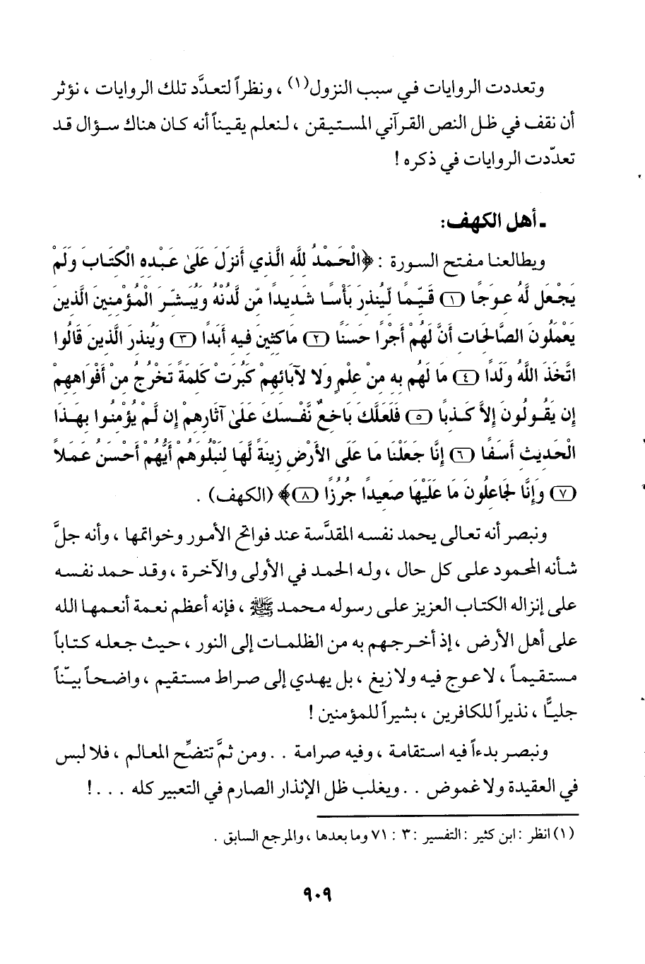 ويطالعنا مفتح السورة: {الْحَمْدُ لِلَّهِ الَّذِي أَنْزَلَ عَلَى عَبْدِهِ الْكِتَابَ وَلَمْ يَجْعَلْ لَهُ عِوَجًا (1) قَيِّمًا لِيُنْذِرَ بَأْسًا شَدِيدًا مِنْ لَدُنْهُ وَيُبَشِّرَ الْمُؤْمِنِينَ الَّذِينَ يَعْمَلُونَ الصَّالِحَاتِ أَنَّ لَهُمْ أَجْرًا حَسَنًا (2) مَاكِثِينَ فِيهِ أَبَدًا (3) وَيُنْذِرَ الَّذِينَ قَالُوا اتَّخَذَ اللَّهُ وَلَدًا (4) مَا لَهُمْ بِهِ مِنْ عِلْمٍ وَلَا لِآبَائِهِمْ كَبُرَتْ كَلِمَةً تَخْرُجُ مِنْ أَفْوَاهِهِمْ إِنْ يَقُولُونَ إِلَّا كَذِبًا (5) فَلَعَلَّكَ بَاخِعٌ نَفْسَكَ عَلَى آثَارِهِمْ إِنْ لَمْ يُؤْمِنُوا بِهَذَا الْحَدِيثِ أَسَفًا (6) إِنَّا جَعَلْنَا مَا عَلَى الْأَرْضِ زِينَةً لَهَا لِنَبْلُوَهُمْ أَيُّهُمْ أَحْسَنُ عَمَلًا (7) وَإِنَّا لَجَاعِلُونَ مَا عَلَيْهَا صَعِيدًا جُرُزًا (8)} (الكهف).