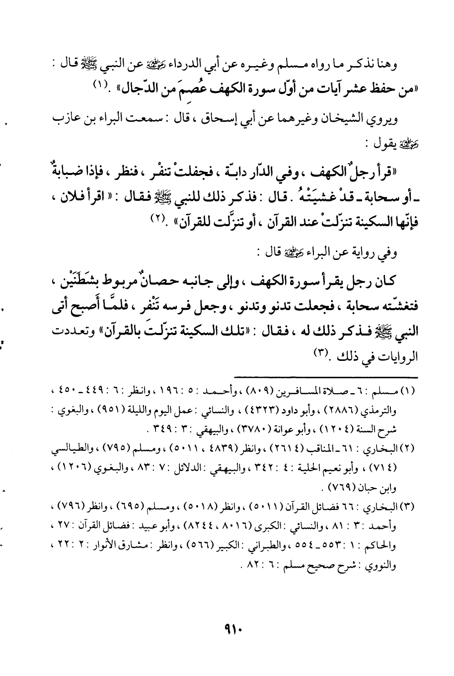 "قرأ رجلٌ الكهف، وفي الدّار دابّة، فجفلتْ تنفْر، فنظر، فإذا ضبابةٌ -أو سحابة- قدْ غشيَتْهُ. قال: فذكر ذلك للنبي - صلى الله عليه وسلم - فقال: "اقرأ فلان، فإنّها السكينة تنزّلتْ عند القرآن، أو تنزَّلت للقرآن". (¬2)