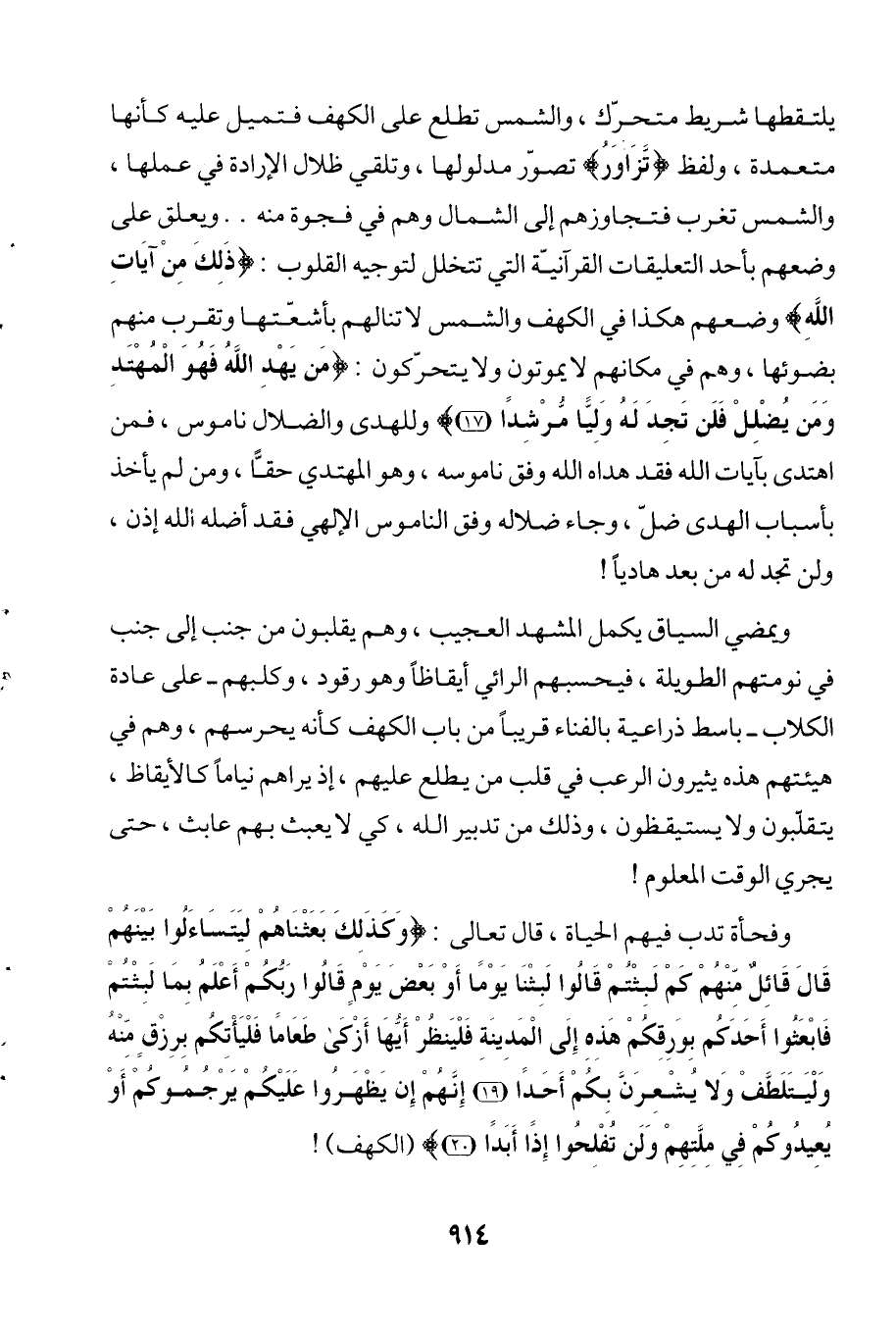 يلتقطها شريط متحرّك، والشمس تطلع على الكهف فتميل عليه كأنها متعمدة، ولفظ {تَزَاوَرُ} تصوّر مدلولها، وتلقي ظلال الإرادة في عملها، والشمس تغرب فتجاوزهم إلى الشمال وهم في فجوة منه .. ويعلق على وضعهم بأحد التعليقات القرآنيّة التي تتخلل لتوجيه القلوب {ذَلِكَ مِنْ آيَاتِ اللَّهِ} وضعهم هكذا في الكهف والشمس لا تنالهم بأشعّتها وتقرب منهم بضوئها، وهم في مكانهم لا يموتون ولا يتحركون: {مَنْ يَهْدِ اللَّهُ فَهُوَ الْمُهْتَدِ وَمَنْ يُضْلِلْ فَلَنْ تَجِدَ لَهُ وَلِيًّا مُرْشِدًا (17)} هو وللهدى والضلال ناموس، فمن اهتدى بآيات الله فقد هداه الله وفق ناموسه، وهو المهتدي حقًّا، ومن لم يأخذ بأسباب الهدى ضلّ، وجاء ضلاله وفق الناموس الإلهي فقد أصله الله إذن، ولن تجد له من بعد هادياً!