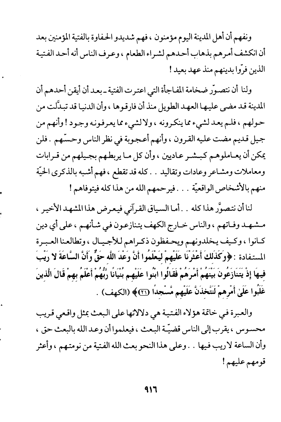 ولنا أن نتصوّر ضخامة المفاجأة التي اعترف الفتية -بعد أن أيقن أحدهم أن المدينة قد مضى عليها العهد الطويل منذ أن فارقوها، وأن الدنيا قد تبدَّلت من حولهم، فلم يعد لشيء مما ينكرونه، ولا لشيء مما يعرفونه وجود! وأنهم من جيل قديم مضت عليه القرون، وأنهم أعجوبة في نظر الناس وحسّهم. فلن يمكن أن يعاملوهم كبشر عاديين، وأن كل ما يربطهم بجيلهم من قرابات ومعاملات ومشاعر وعادات وتقاليد .. كله قد تقطع، فهم أشبه بالذكرى الحيّة منهم بالأشخاص الواقعيّة ... فيرحمهم الله من هذا كله فيتوفاهم!