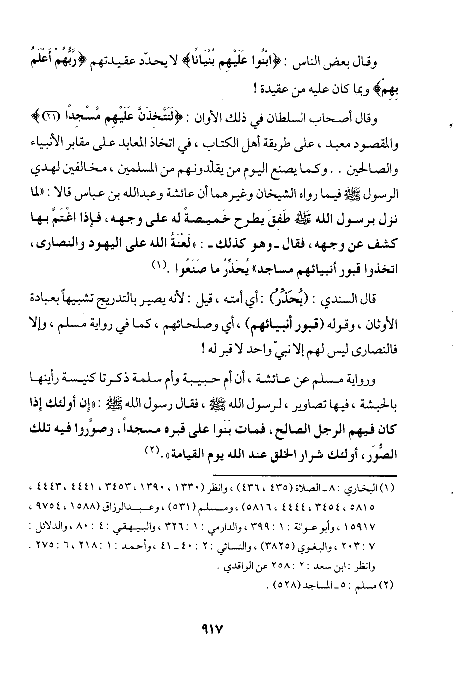 ورواية مسلم عن عائشة، أن أم حبيبة وأم سلمة ذكرتا كنيسة رأينها بالحبشة، فيها تصاوير، لرسول الله - صلى الله عليه وسلم -، فقال رسول الله - صلى الله عليه وسلم -: "إِن أولئك إِذا كان فيهم الرجل الصالح، فمات بَنَوا على قبره مسجداً، وصوَّروا فيه تلك الصُّوَر، أولئك شرار الحلق عند الله يوم القيامة". (¬2)