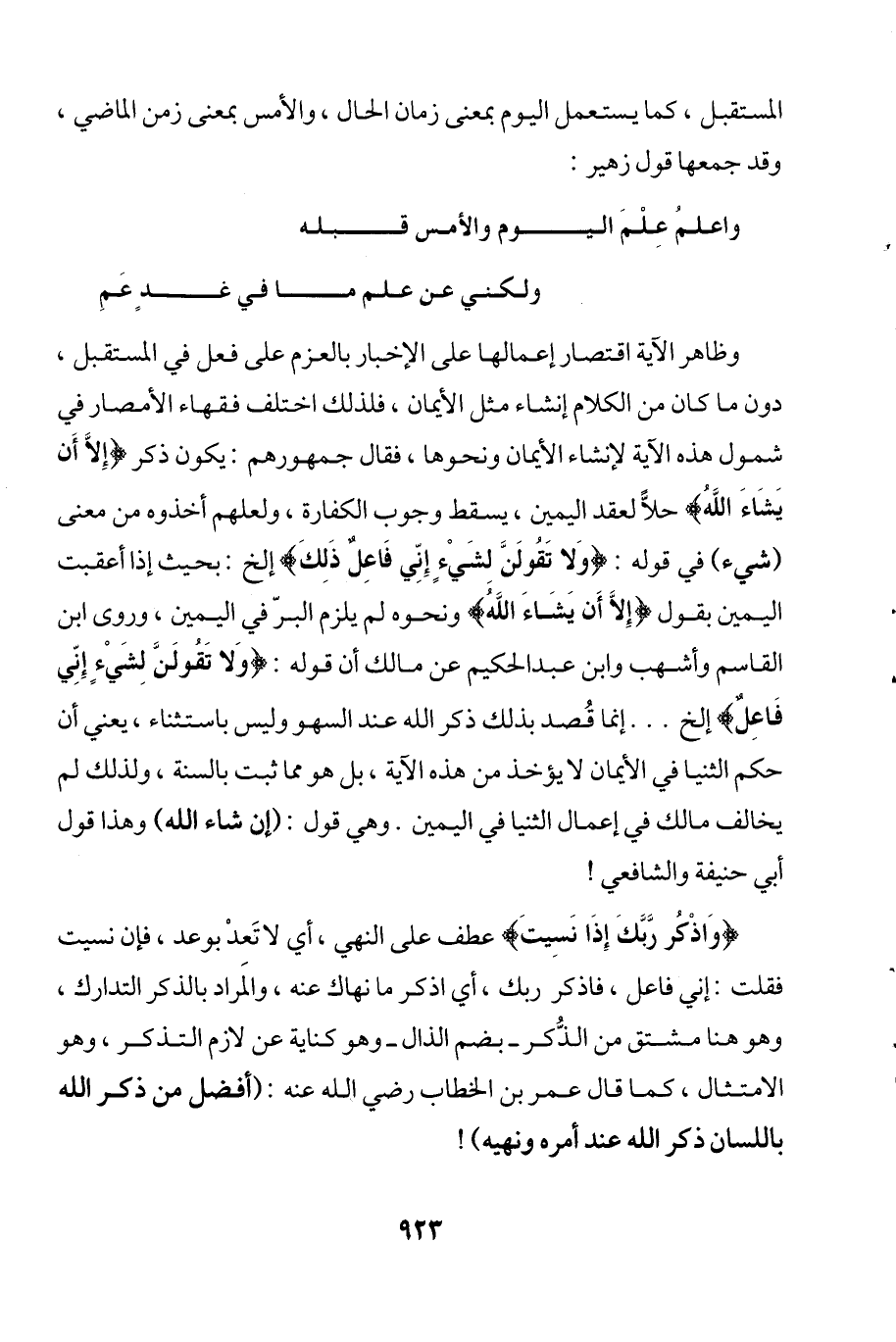 وظاهر الآية اقتصار إعمالها على الإخبار بالعزم على فعل في المستقبل، دون ما كان من الكلام إنشاء مثل الأيمان، فلذلك اختلف فقهاء الأمصار في شمول هذه الآية لإنشاء الأيمان ونحوها، فقال جمهورهم: يكون ذكر {إِلَّا أَن يَشَاءَ اللهُ} حلاًّ لعقد اليمين، يسقط وجوب الكفارة، ولعلهم أخذوه من معنى (شيء) في قوله: {وَلا تَقُولَنَّ لِشَيْءٍ إِنِّي فَاعِلٌ ذَلِكَ} إلخ: بحيث إذا أعقبت اليمين بقول {إِلَّا أَنْ يَشَاءَ اللَّهُ} ونحوه لم يلزم البرّ في اليمين، وروى ابن القاسم وأشهب وابن عبد الحكيم عن مالك أن قوله: {وَلَا تَقُولَنَّ لِشَيْءٍ إِنِّي فَاعِلٌ} إلخ ... إنما قُصد بذلك ذكر الله عند السهو وليس باستثناء، يعني أن حكم الثنيا في الأيمان لا يؤخذ من هذه الآية، بل هو مما ثبت بالسنة، ولذلك لم يخالف مالك في إعمال الثنيا في اليمين. وهي قول: (إن شاء الله) وهذا قول أبي حنيفة والشافعي!