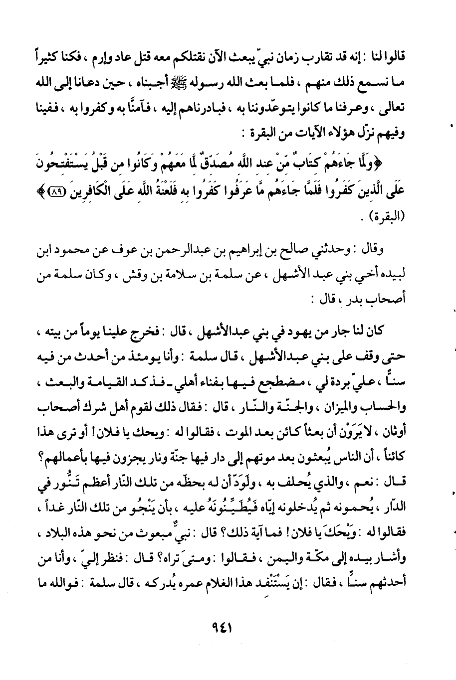 كان لنا جار من يهود في بني عبد الأشهل، قال: فخرج علينا يوماً من بيته، حتى وقف على بني عبد الأشهل، قال سلمة: وأنا يومئذ من أحدث من فيه سنًّا، عليّ بردة لي، مضطجع فيها بفناء أهلي -فذكر القيامة والبعث، والحساب والميزان، والجنّة والنّار، قال: فقال ذلك لقوم أهل شرك أصحاب أوثان، لا يَرَوْن بعثاً كائن بعد الموت، فقالوا له: ويحك يا فلان! أوَ ترى هذا كائناً، أن الناس يُبعثون بعد موتهم إلى دار فيها جنّة ونار يجزون فيها بأعمالهم؟ قال: نعم، والذي يُحلف به، ولَوَدّ أن له بحظّه من تلك النّار أعظم تَنُّور في الدّار، يُحمونه ثم يُدخلونه إيّاه فَيُطَيِّنُونَهُ عليه، بأن يَنْجُو من تلك النّار غداً، فقالوا له: وَيْحَكَ يا فلان! فما آية ذلك؟ قال: نبيٌّ مبعوث من نحو هذه البلاد، وأشار بيده إلى مكّة واليمن، فقالوا: ومتَى تراه؟ قال: فنظر إليّ، وأنا من أحدثهم سنًّا، فقال: إن يَسْتَنْفِد هذا الغلام عمره يُدركه، قال سلمة: فوالله ما
