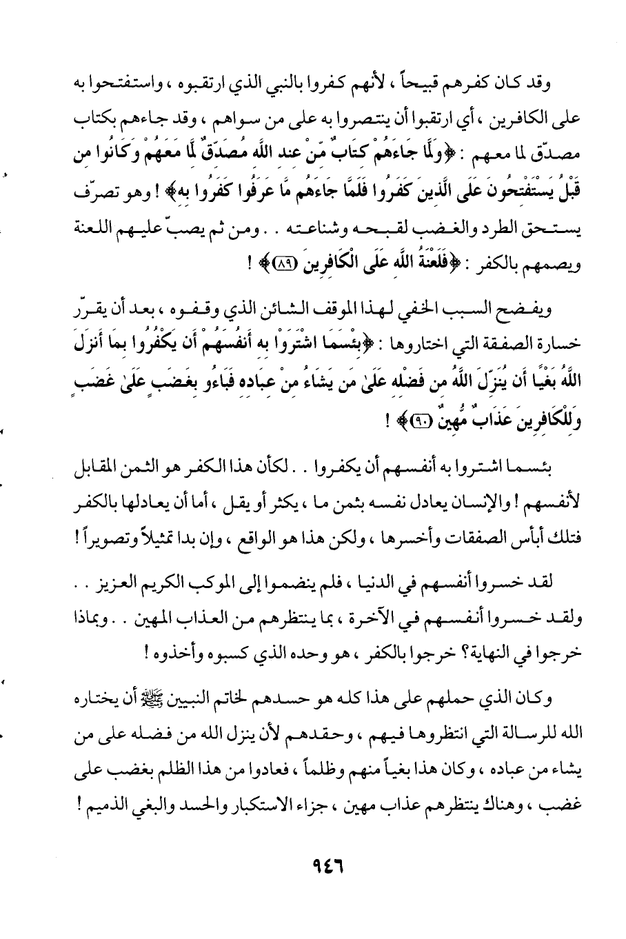 ويفضح السبب الخفي لهذا الموقف الشائن الذي وقفوه، بعد أن يقرّر خسارة الصفقة التي اختاروها: {بِئْسَمَا اشْتَرَوْا بِهِ أَنْفُسَهُمْ أَنْ يَكْفُرُوا بِمَا أَنْزَلَ اللَّهُ بَغْيًا أَنْ يُنَزِّلَ اللَّهُ مِنْ فَضْلِهِ عَلَى مَنْ يَشَاءُ مِنْ عِبَادِهِ فَبَاءُوا بِغَضَبٍ عَلَى غَضَبٍ وَلِلْكَافِرِينَ عَذَابٌ مُهِينٌ (90)}!