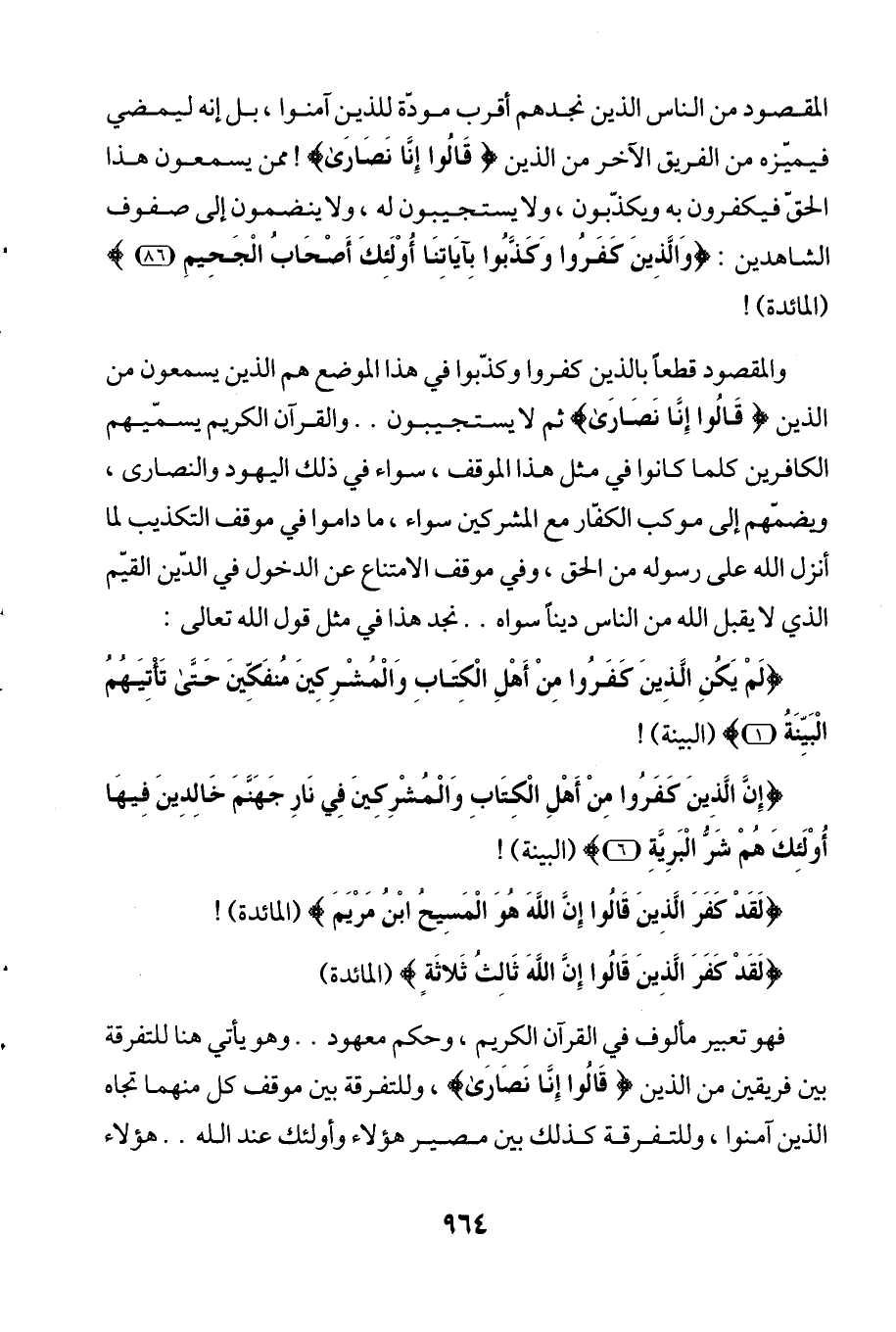 والمقصود قطعاً بالذين كفروا وكذّبوا في هذا الموضع هم الذين يسمعون من الذين {قَالُوا إِنَّا نَصَارَى} ثم لا يستجيبون .. والقرآن الكريم يسمّيهم الكافرين كلما كانوا في مثل هذا الموقف، سواء في ذلك اليهود والنصارى، ويضمّهم إلى موكب الكقّار مع المشركين سواء، ما داموا في موقف التكذيب لما أنزل الله على رسوله من الحق، وفي موقف الامتناع عن الدخول في الدّين القيم الذي لا يقبل الله من الناس ديناً سواه .. نجد هذا في مثل قول الله تعالى: