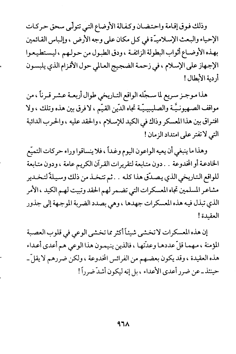 وذلك فوق إقامة واحتضان وكفالة الأوضاع التي تتولّى سحق حركات الإحياء والبعث الإِسلاميّة في كل مكان على وجه الأرض، وإلباس القائمين بهذه الأوضاع أثواب البطولة الزائفة، ودق الطبول من حولهم، ليستطيعوا الإجهاز على الإِسلام، في زحمة الضجيج العالمي حول الأقزام الذي يلبسون أردية الأبطال!