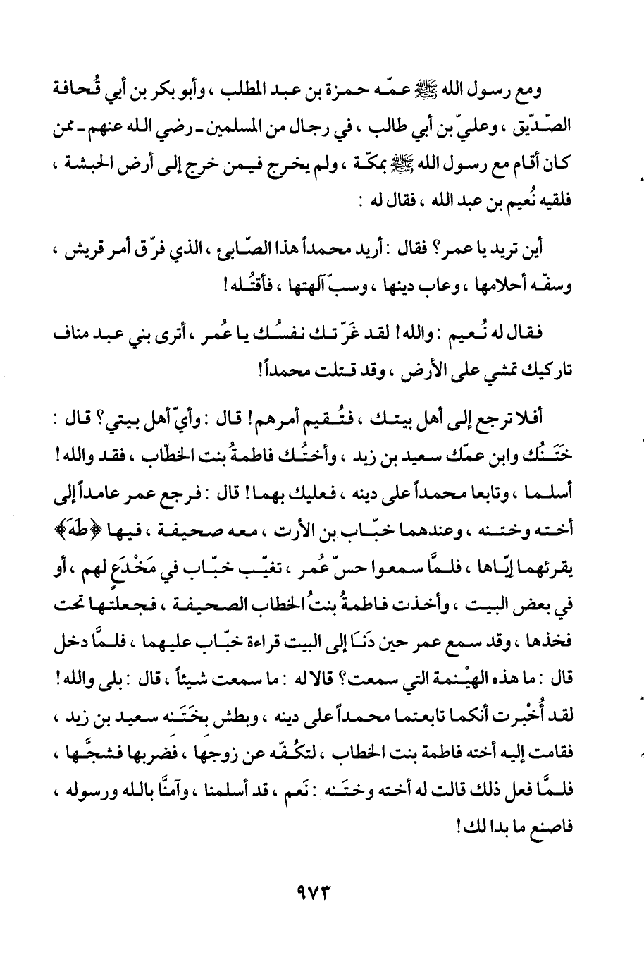 أفلا ترجع إلى أهل بيتك، فتُقيم أمرهم! قال: وأيّ أهل بيتي؟ قال: خَتَنُك وابن عمّك سعيد بن زيد، وأختُك فاطمةُ بنت الخطاب، فقد والله! أسلما، وتابعا محمداً على دينه، فعليك بهما! قال: فرجع عمر عامداً إلى أخته وختنه، وعندهما خبّاب بن الأرت، معه صحيفة، فيها {طهَ} يقرئهما إيّاها، فلمَّا سمعوا حسّ عُمر، تغيّب خبّاب في مَخْدَعٍ لهم، أو في بعض البيت، وأخذت فاطمةُ بنتُ الخطاب الصحيفة، فجعلتها تحت فخذها، وقد سمع عمر حين دَنَا إلى البيت قراءة خبّاب عليهما، فلمَّا دخل قال: ما هذه الهيْنمة التي سمعت؟ قالا له: ما سمعت شيئاً، قال: بلى والله! لقد أُخْبرت أنكما تابعتما محمداً على دينه، وبطش بخَتَنِه سعيد بن زيد، فقامت إليه أخته فاطمة بنت الخطاب، لتكُفّه عن زوجَها، فضربها فشجَّها، فلمَّا فعل ذلك قالت له أخته وختَنه: نَعم، قد أسلمنا، وآمنَّا بالله ورسوله، فاصنع ما بدا لك!