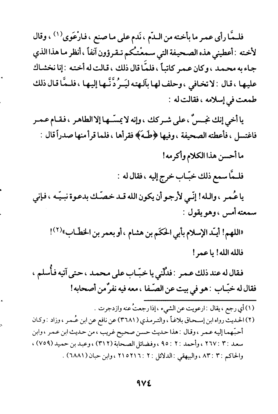 فلمَّا رأى عمر ما بأخته من الدّم، نَدم على ما صنع، فارْعَوى (¬1)، وقال لأخته: أعطيني هذه الصحيفة التي سمعْتكم تقرؤون آنفاً، أنظر ما هذا الذي جاء به محمَّد، وكان عمر كاتباً، فلمّا قال ذلك، قالت له أخته: إنا نخشاك عليها، قال: لا تخافي، وحلف لها بآلهته ليَرُدَّنَّها إليها، فلمَّا قال ذلك طمعت في إسلامه، فقالت له: